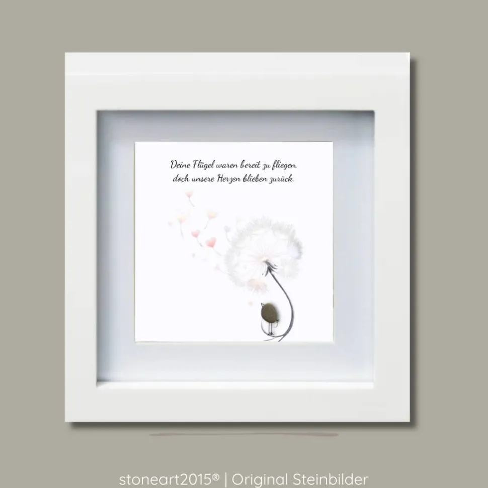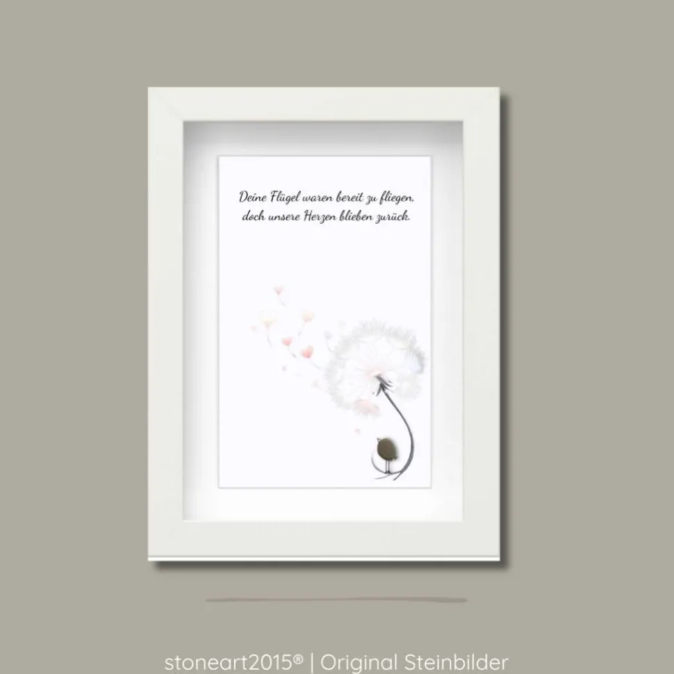 Ein Naturkiesel als Stängel einer zarten Pusteblume – deren Samen als kleine Herzchen in den Wind davonfliegen. Ein stilles, berührendes Motiv das in wenigen Worten und einem einzigen Bild alles sagt, was das Herz in der Trauer fühlt.