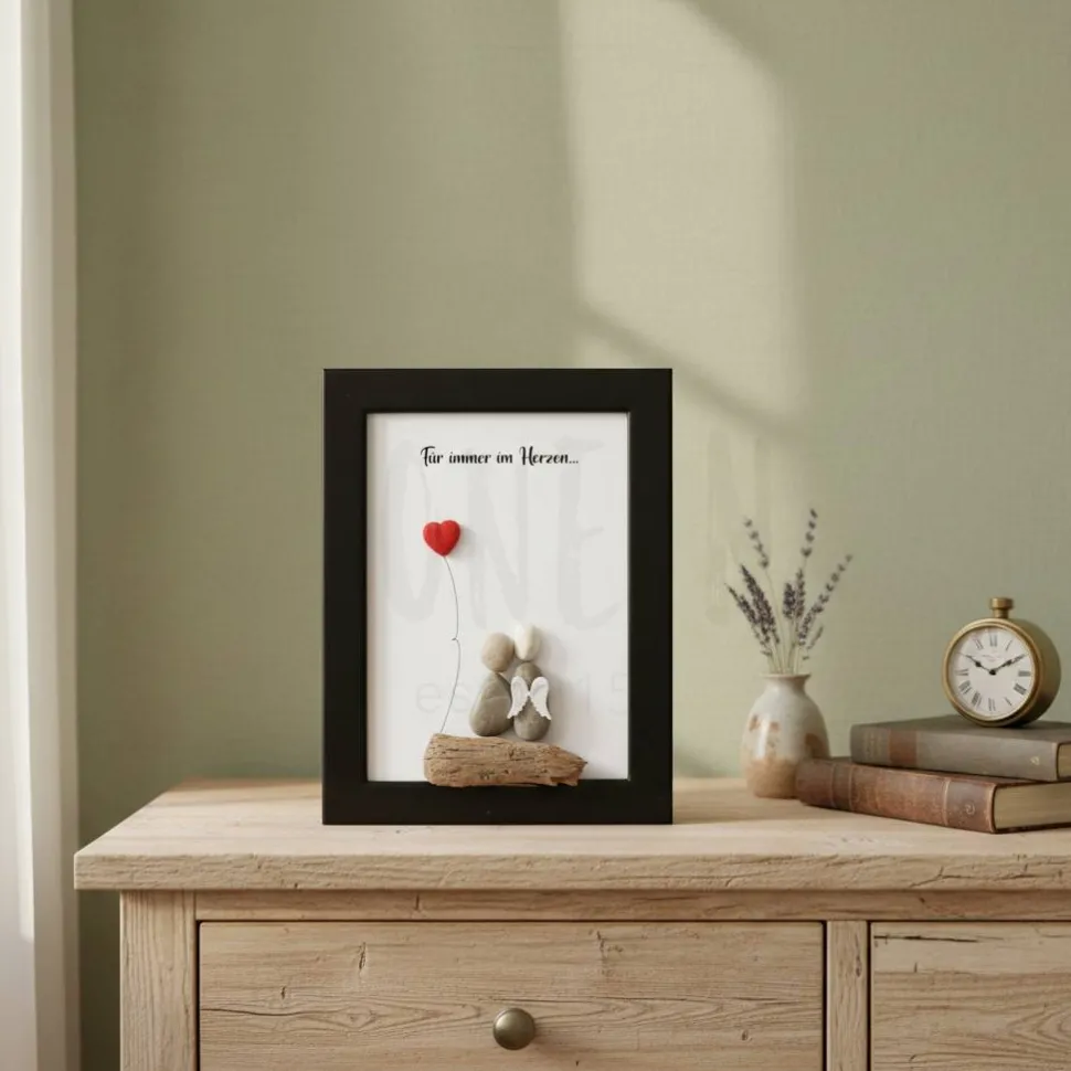 Ein einfühlsames Motiv aus echten Naturkieseln, das Trost spendet und die Erinnerung an einen besonderen Menschen bewahrt. Ein Geschenk, das zeigt: Der Tod nimmt einen Menschen aus unserer Mitte – aber niemals aus unseren Herzen.