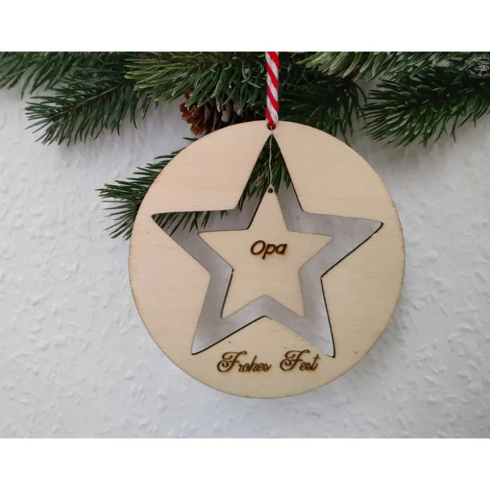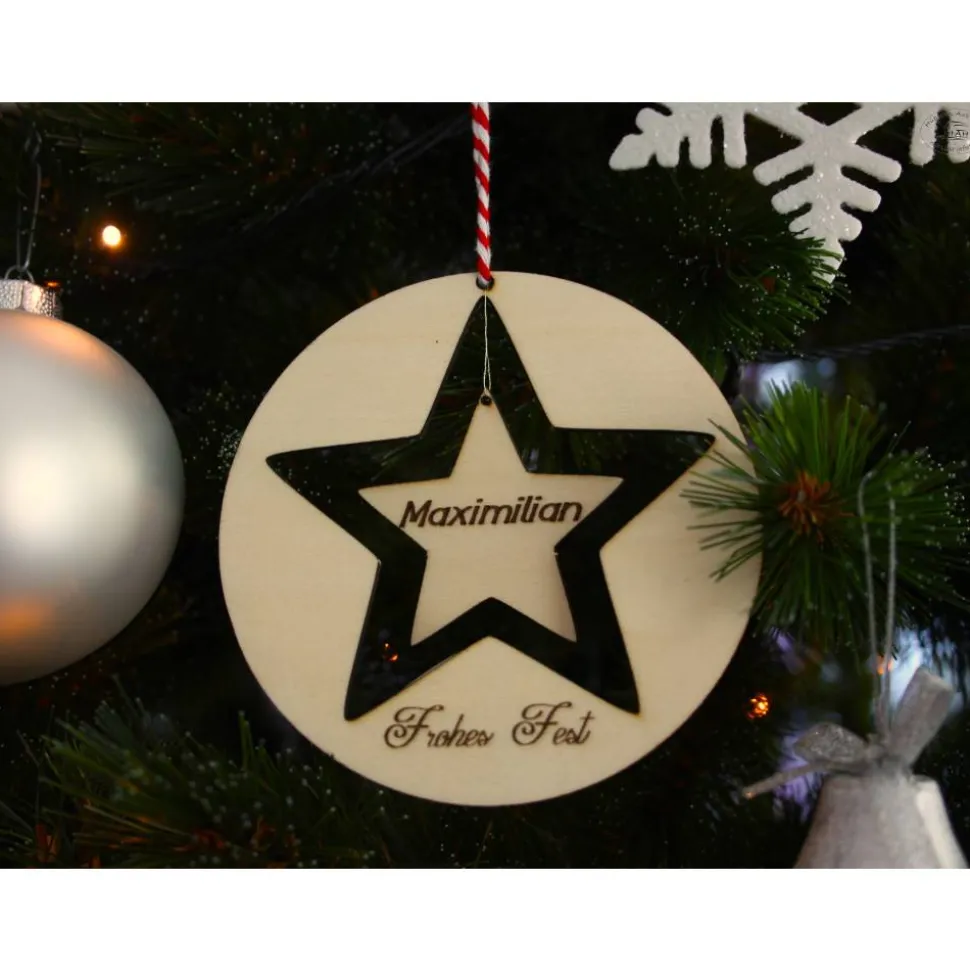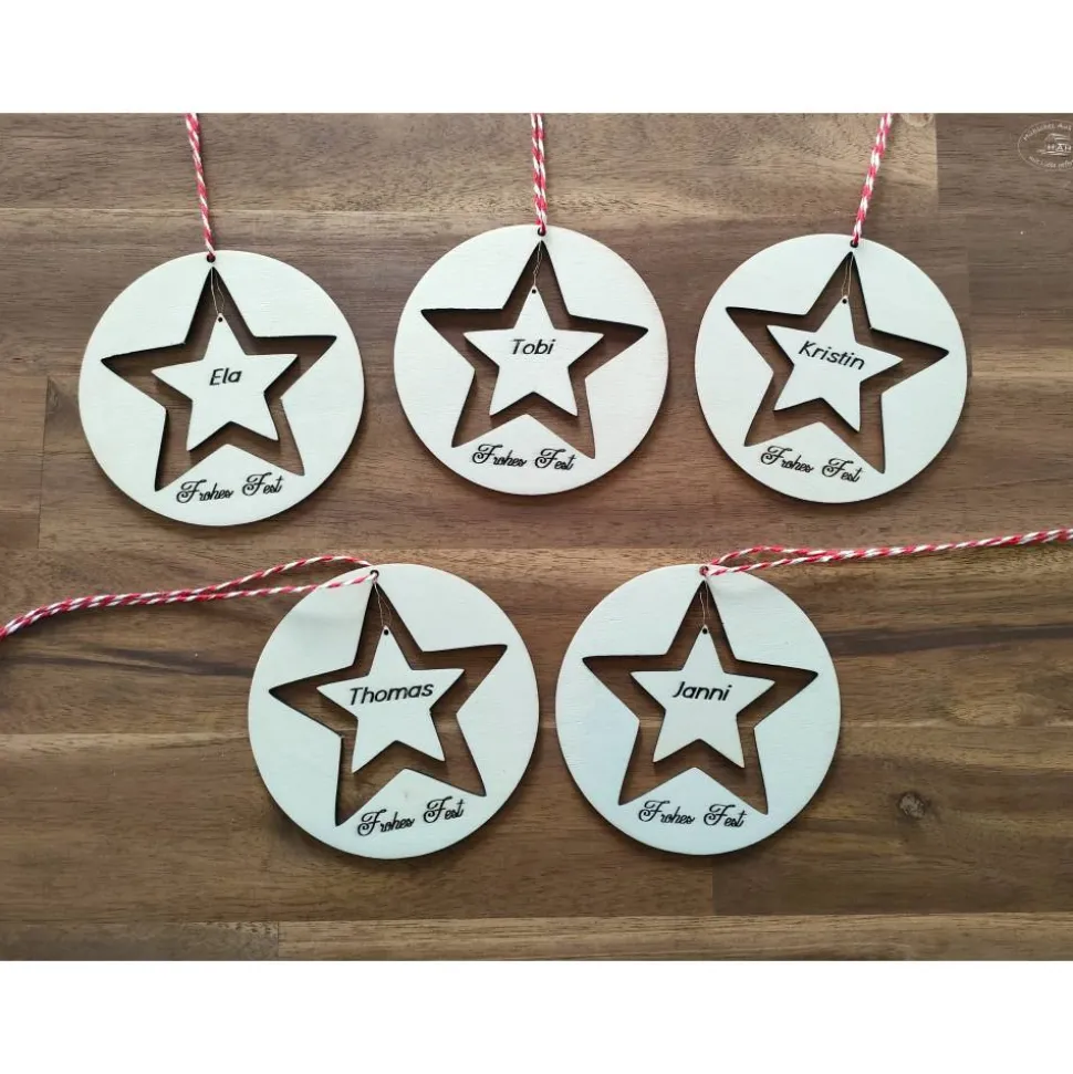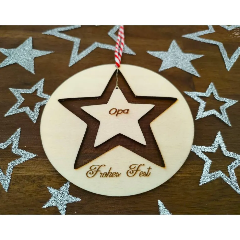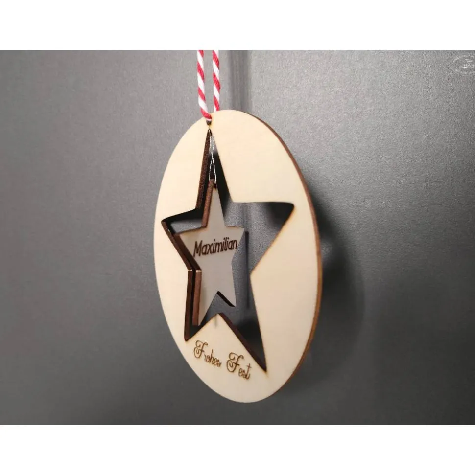 Stern-Anhänger“ Frohes Fest“ mit rot-weißer Baumwollkordel, beidseitiggraviert und mit Name im kleinen Stern personalisiert.