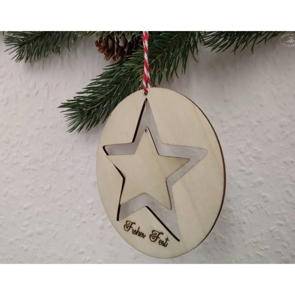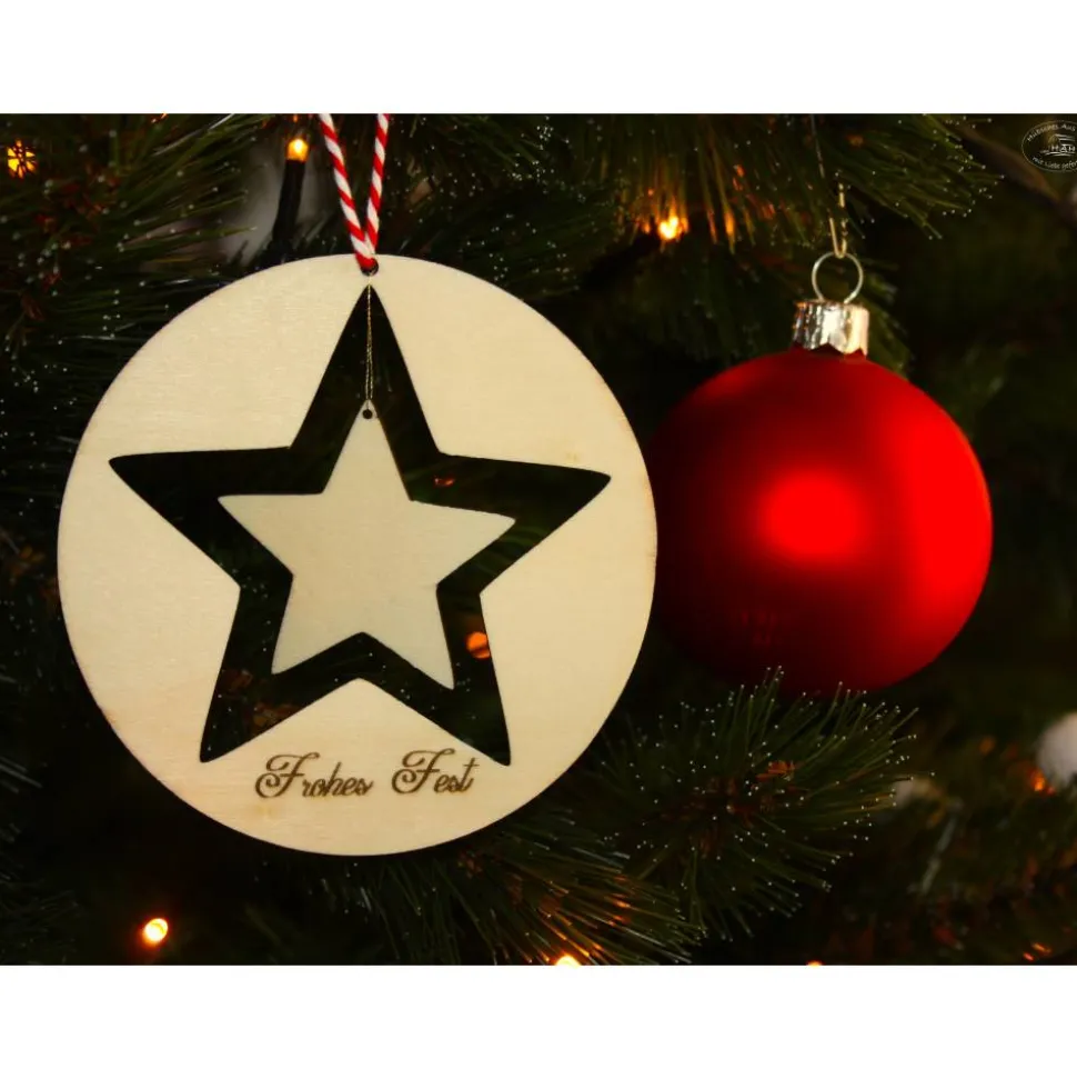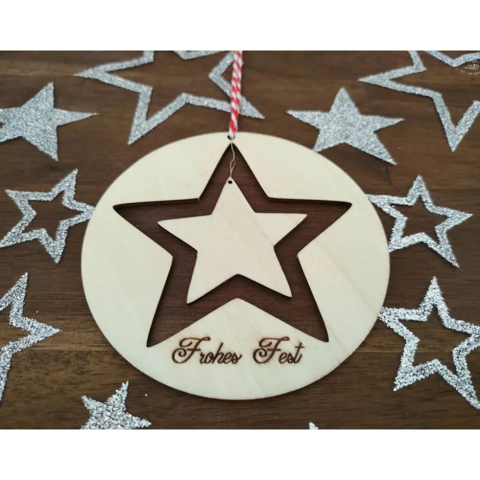 Stern-Anhänger“ Frohes Fest“ mit rot-weißer Baumwollkordel, beidseitig graviert und mit Name im kleinen Stern personalisiert.