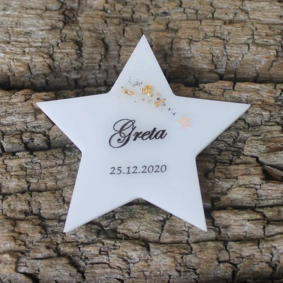 Den Untergrund fertige ich aus weiß gefärbtem Epoxidharz, auf Wunsch auch gerne in rosa oder hellblau. Eine Sternschnuppe aus einem irisierenden Stern, der je nach Lichteinfall seine Farbe verändert, schmückt das Erinnerungsstück. Im Schweif sind goldfarbene Flöckchen sowie Sternenstaub(Späne aus Metall- oder Eisenmeteoriten) eingefügt.