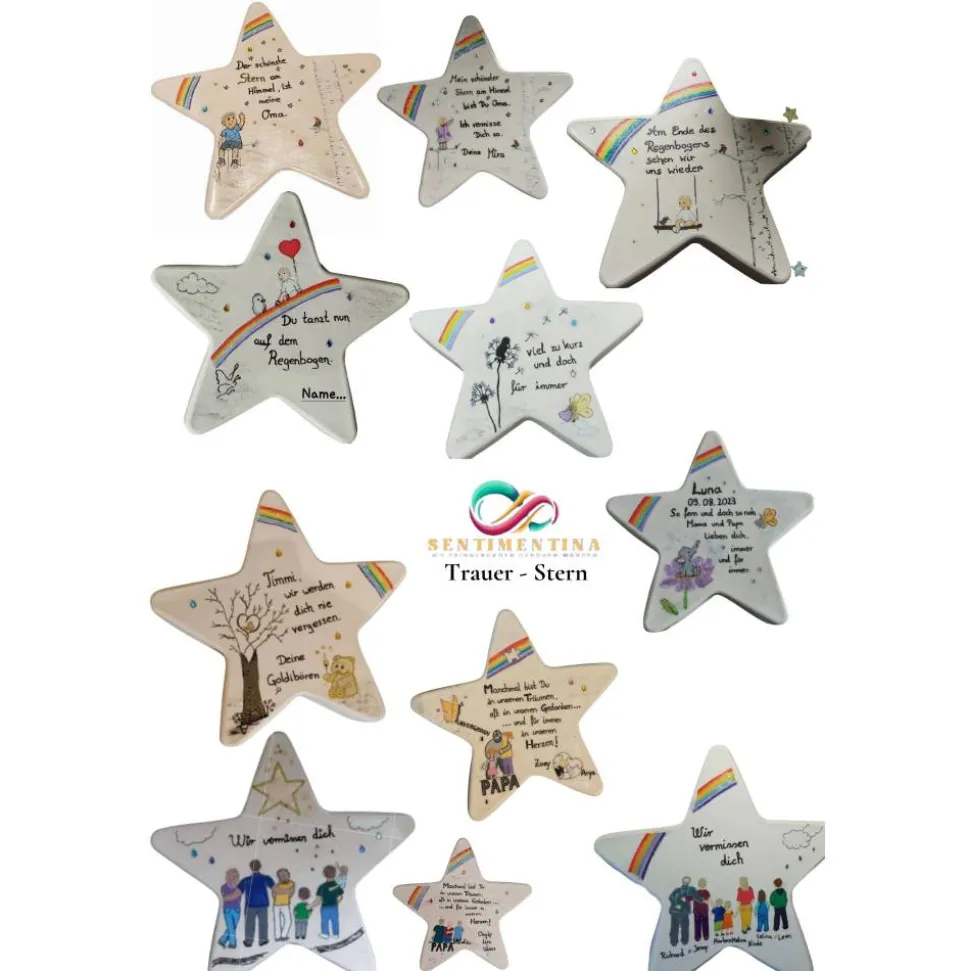 Ob als Grabbeigabe, zur Dekoration einer Gedenkstätte oder als stiller Begleiter im Zuhause – dieser Stern schenkt Trost und erinnert daran, dass die Liebe bleibt ????.Hergestellt aus hochwertiger Reliefgießmasse, liebevoll handbemalt mit lebendigen Acrylfarben und versiegelt mit einem glänzenden Kunstharzlack für lang anhaltende Schönheit und Schutz vor Abnutzung.Bitte beachten Sie, dass leichte Farbabweichungen bei handgefertigten Produkten auftreten können. Jedes Stück ist einzigartig und wird individuell hergestellt.Für den Innen- und Außenbereich geeignet: Unsere Steine sind so gestaltet, dass sie drinnen und draußen platziert werden können. Um ihre Schönheit zu bewahren, empfehlen wir, den Stein im Außenbereich regelmäßig nachzulackieren, wofür spezieller Lack in unserem Shop erhältlich ist. Dieser Lack schützt vor Witterungseinflüssen und verlängert die Lebensdauer Ihres Steins, damit er auch weiterhin Freude verbreiten kann. ????️????Vor Frost bitte schützen.Für die Lebensdauer im Außenbereich gibt es keine Garantie – unsere verwendeten Farben und Lacke sind laut Hersteller Wetterfest