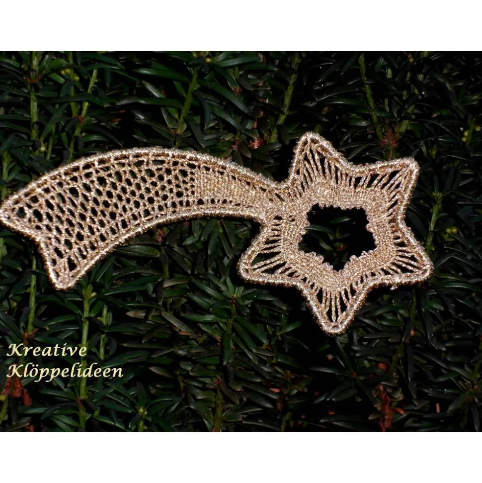 Diesen Stern habe ich mit goldfarbenem Polyestergarn von Hand geklöppelt.