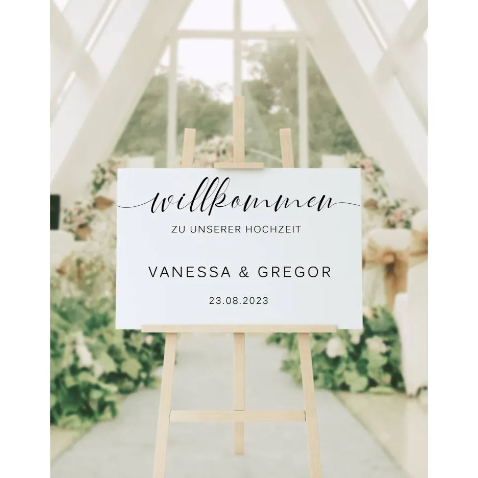 „Willkommen zu unserer Hochzeit“, zwei Namen und ein Datum.