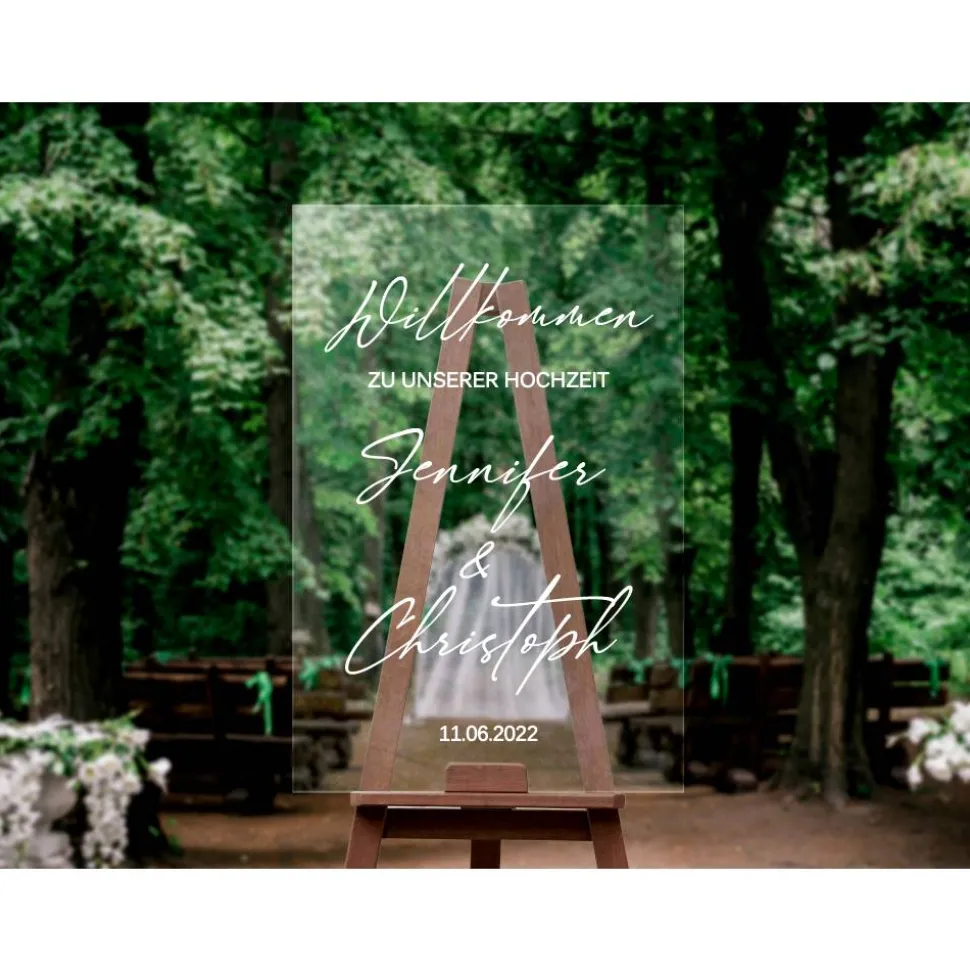 „Willkommen zu unserer Hochzeit“, zwei Namen und ein Datum.