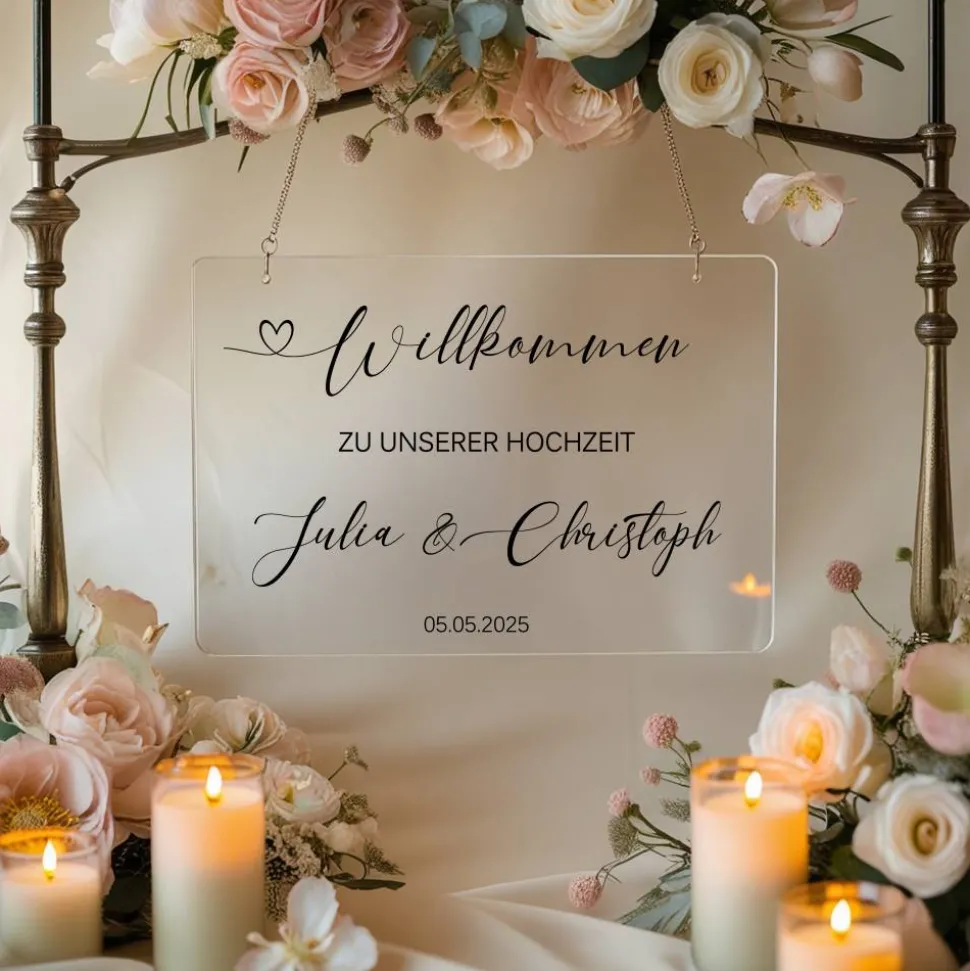 „Willkommen zu unserer Hochzeit“, zwei Namen und ein Datum.