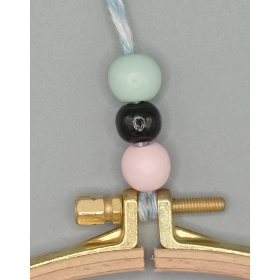 → bestickter Stoff im Stickrahmen, oben mit Schlaufe und 3 Holzperlen