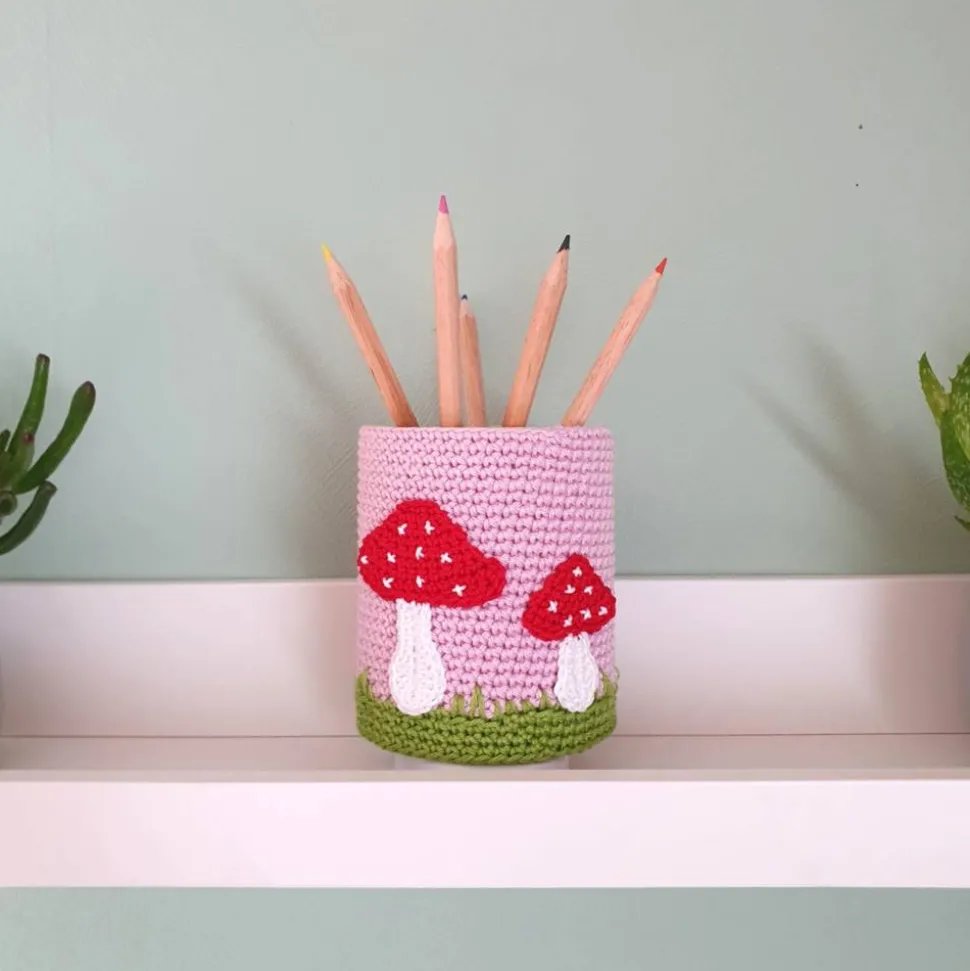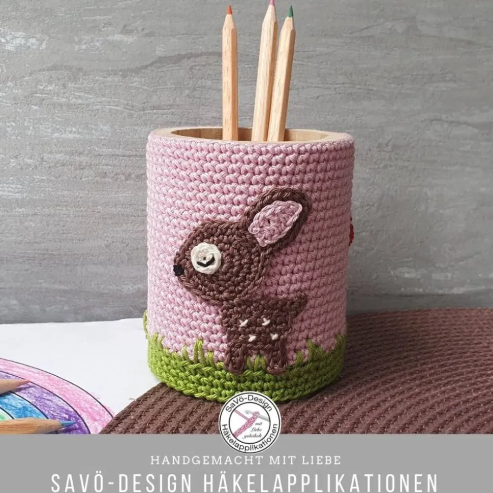Entdecke den liebevoll umhäkelten Stiftebecher mit Reh und Fliegenpilz von Savö-Design!