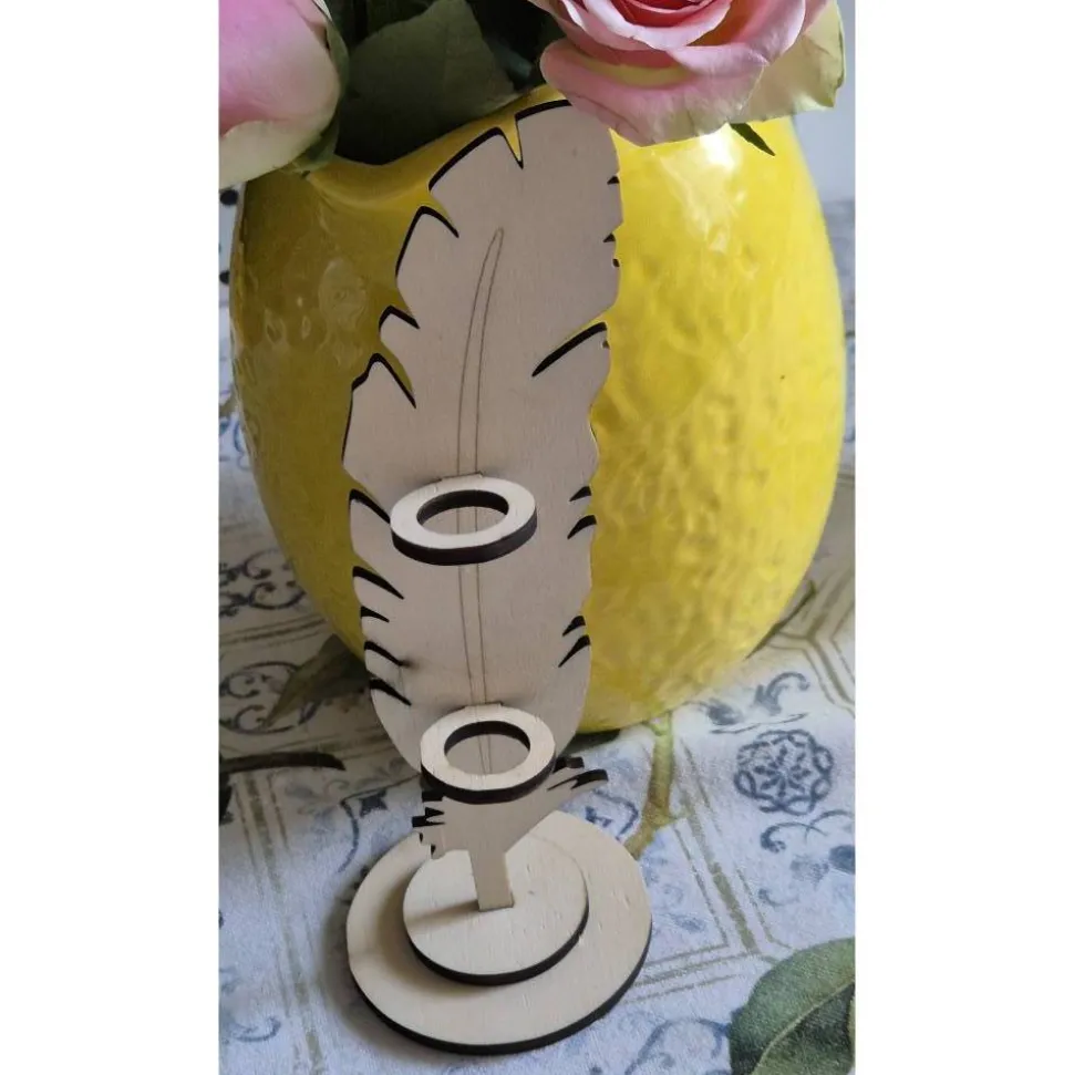 Entdecke diesen tollen Stiftehalter in Federform, gefertigt aus 4mm Bastelholz. Der Stiftehalter bietet sicheren Halt für deinen Kugelschreiber und ist ein echter Blickfang auf jedem Schreibtisch. Die Maße sind: Höhe 19cm, Breite Feder 5cm, Sockel rund ca 7cm.