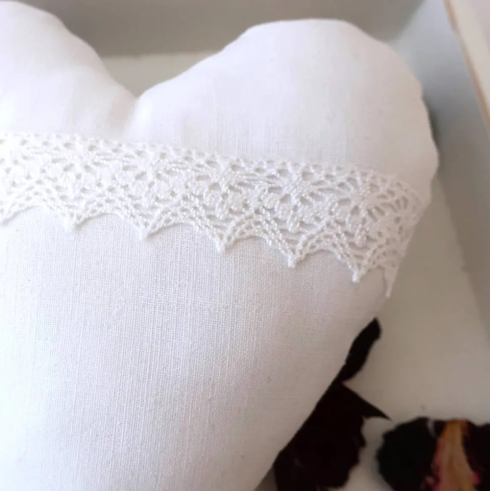 Verleihe deinem Zuhause mit diesem handgefertigten Stoffherz aus weißem Leinen und feiner Klöppelspitze einen Hauch von Vintage-Charme.