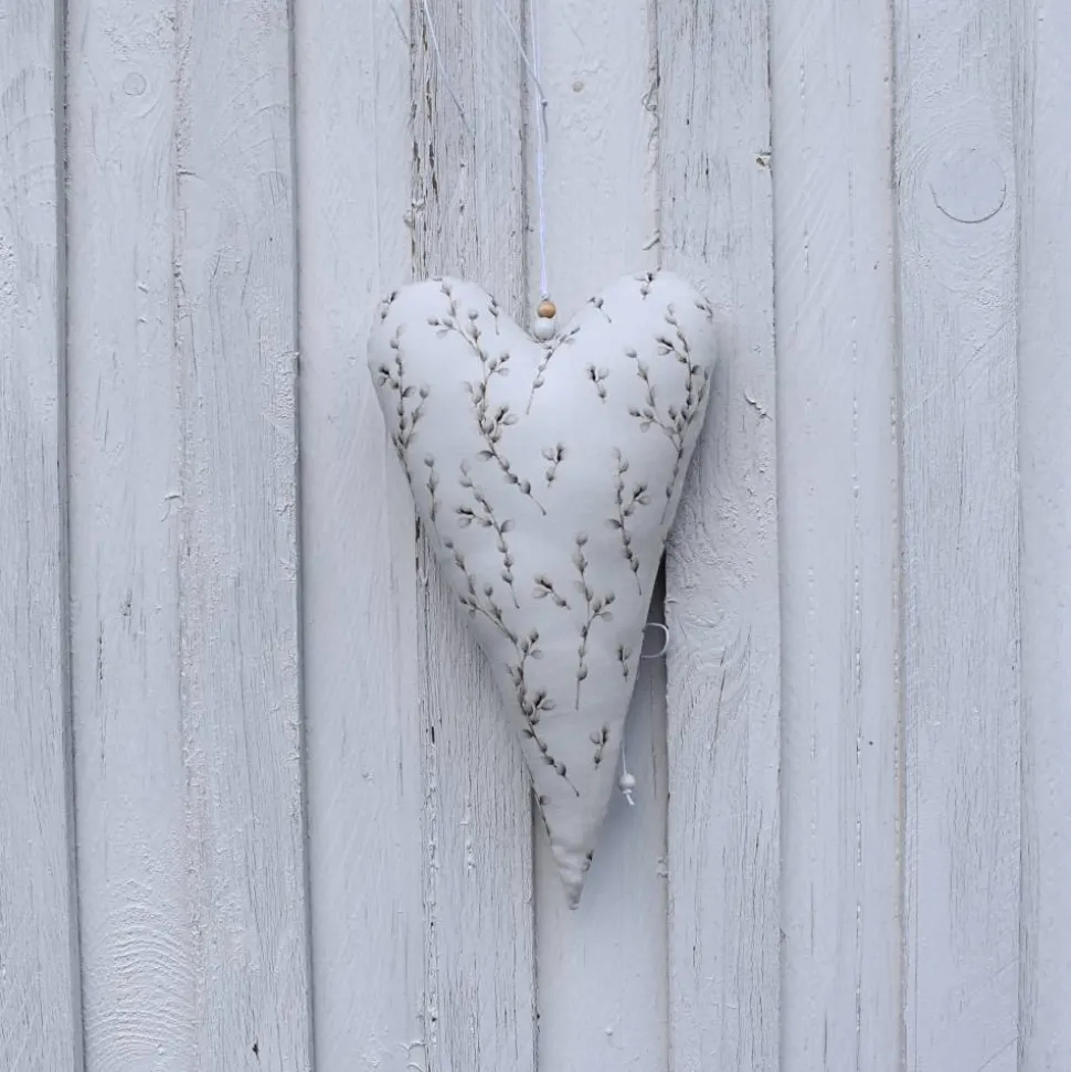 ein beigefarbener grober Baumwollstoff und ein altweißer Webstoff mit Weidenkätzchenzweigen – beide 100 % Baumwolle,