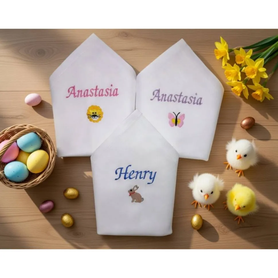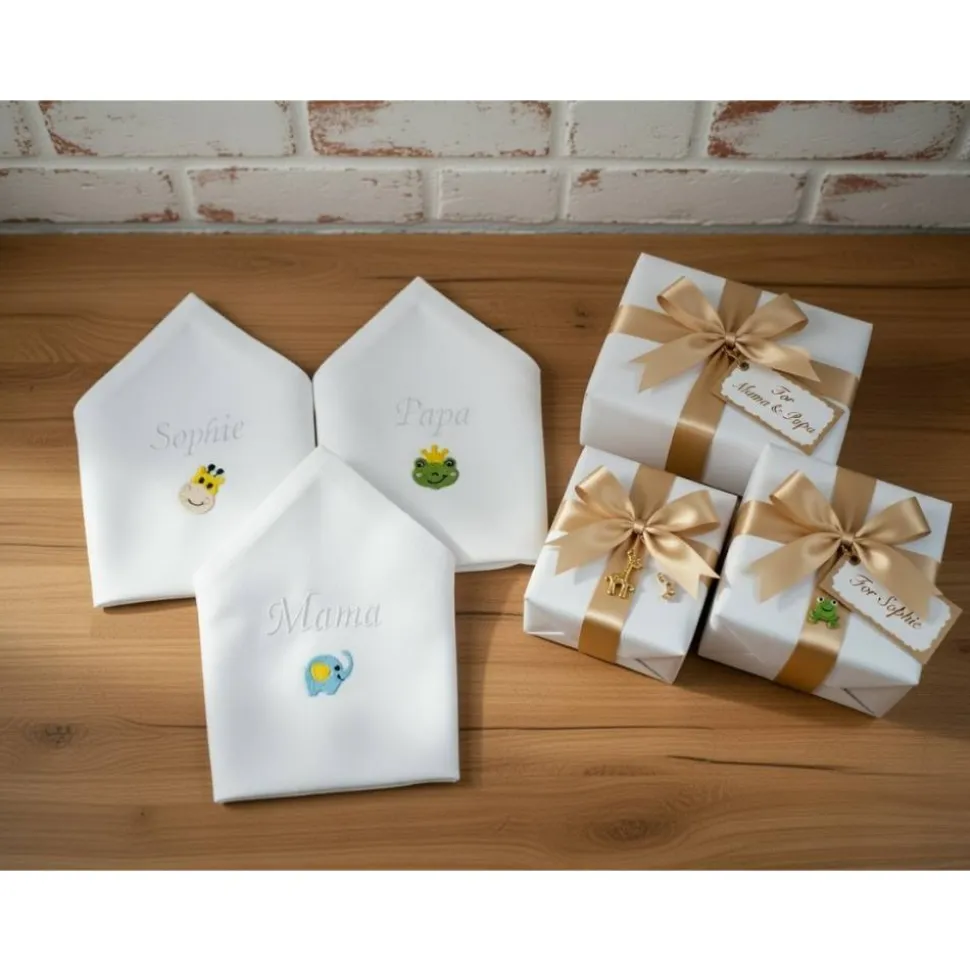 Lieferumfang: Stoffservietten mit Name und Tier bestickt.
