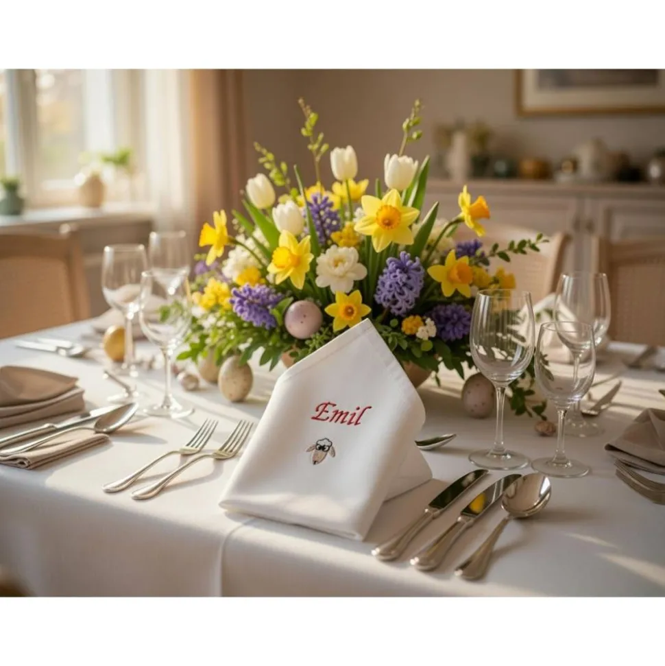 „Bestickten Stoffservietten sind ein echtes 3-in-1-Talent: Sie dienen als edle Tischdekoration, ersetzen die klassische Platzkarte und sind zugleich ein persönliches Gastgeschenk, das ihre Gäste als Erinnerung mit nach Hause nehmen dürfen.“