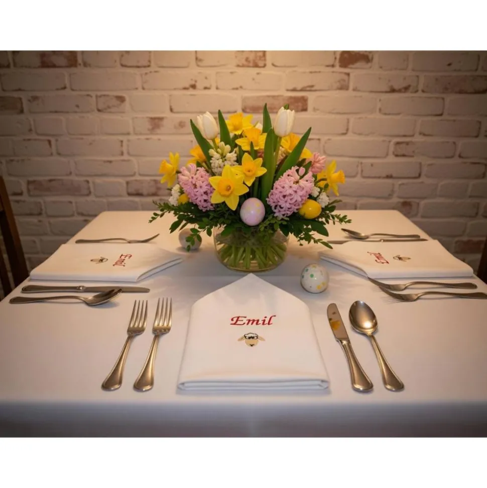 Die Servietten werden mit dem Namen des Gastes in ca. 2 cm Höhe gerade bestickt und Tier.
