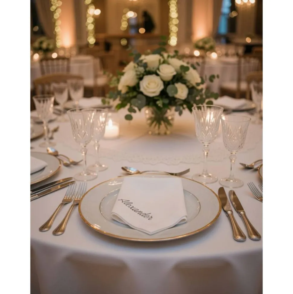 „Bestickten Stoffservietten sind ein echtes 3-in-1-Talent: Sie dienen als edle Tischdekoration, ersetzen die klassische Platzkarte und sind zugleich ein persönliches Gastgeschenk, das ihre Gäste als Erinnerung mit nach Hause nehmen dürfen.“