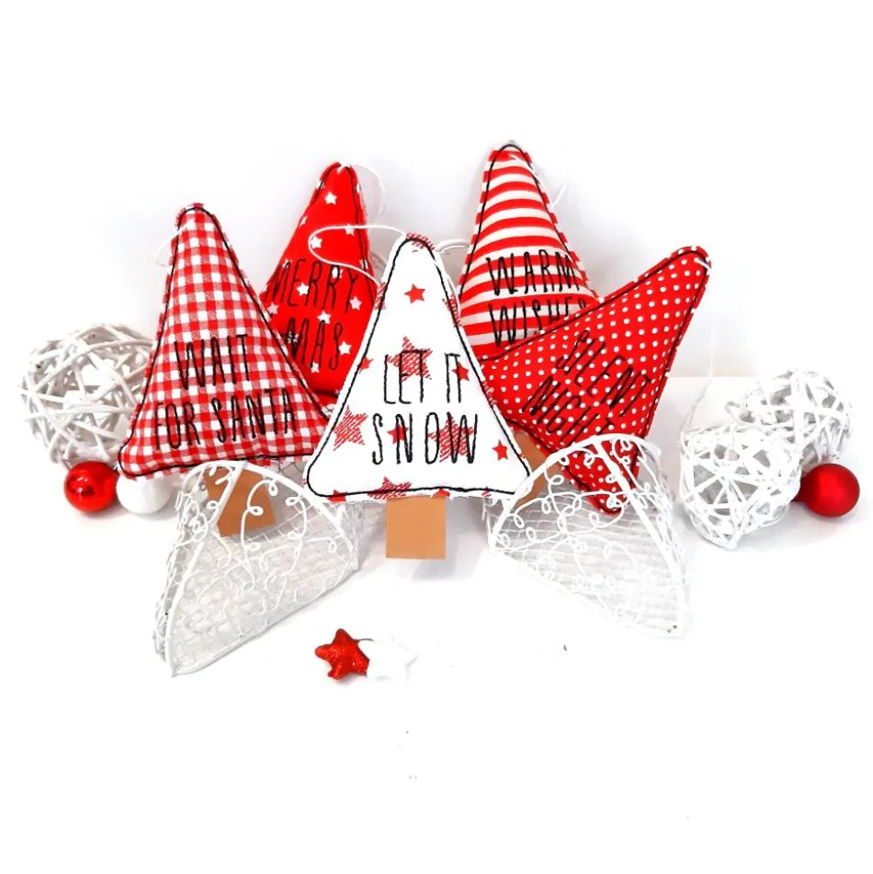 Stofftannenbäume 5er Set bestickt, Baumhänger, Geschenkanhänger