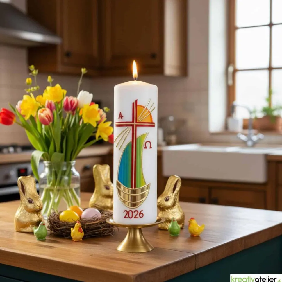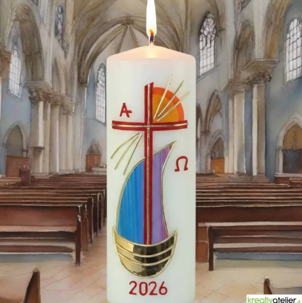 Erleben Sie die erhabene Schönheit und tiefe Symbolik dieser handgefertigten Osterkerze, die das Kreuz, ein Segelschiff, die aufgehende Sonne sowie die Zeichen Alpha und Omega kunstvoll in sich vereint. In zartem Elfenbeinton gehalten, trägt diese Kerze die aktuelle Jahreszahl und wird zum Herzstück Ihrer Osterfeierlichkeiten.