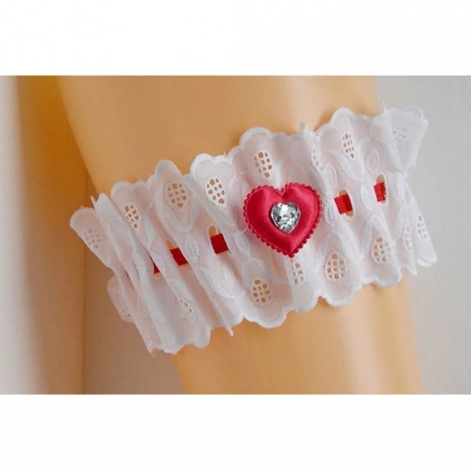 Strumpfband aus weißer Baumwollspitze, 100 % Baumwolle,mit rotem Gummiband und einem roten Herzen in der Mitte und einem kleinen Glitzerherz. Hierzu gibt es auch ein passendes Ringkissen. Setpreis für Strumpfband und SEIDEN-Ringkissen
