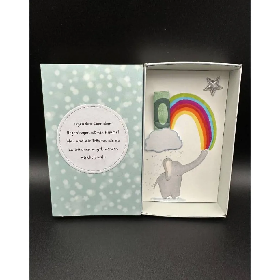 Entdecke die perfekte Geschenkidee zur Taufe oder Geburt: Diese süße Geschenkbox ist liebevoll handgefertigt und begeistert mit einem handgemalten Elefanten, Regenbogen und Regenwolke. Der Geldschein lässt sich einfach oben in die Wolke stecken – so wird das Geldgeschenk auf originelle Weise verpackt. Ein silberner Stern verleiht der Box einen edlen Akzent.