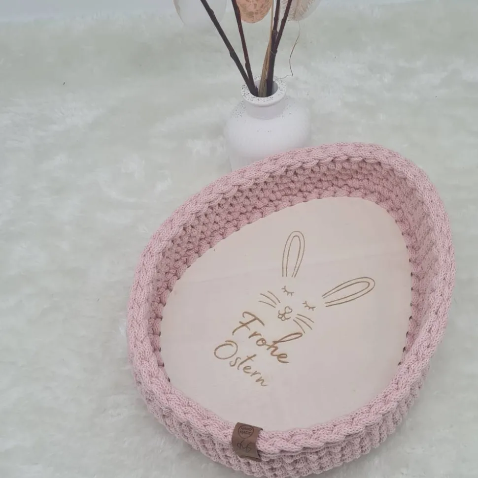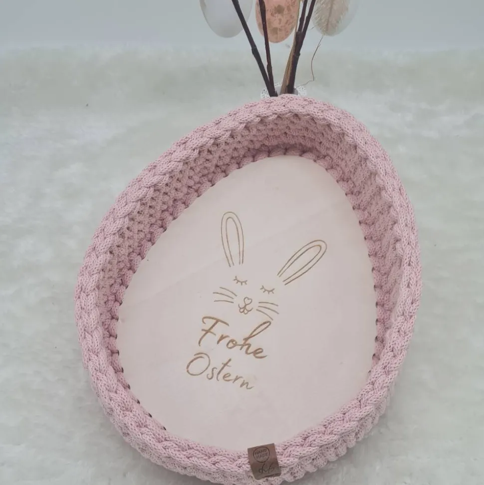 Der stabile Boden aus 3 mm starkem Birkensperrholz verleiht dem Körbchen Halt und Langlebigkeit, während das weiche, hochwertige Bobbiny Garn (5 mm, OEKO-TEX® zertifiziert) für eine natürliche und moderne Optik sorgt. Die sanfte Ei-Form unterstreicht den österlichen Charakter und macht das Körbchen einfach unwiderstehlich.