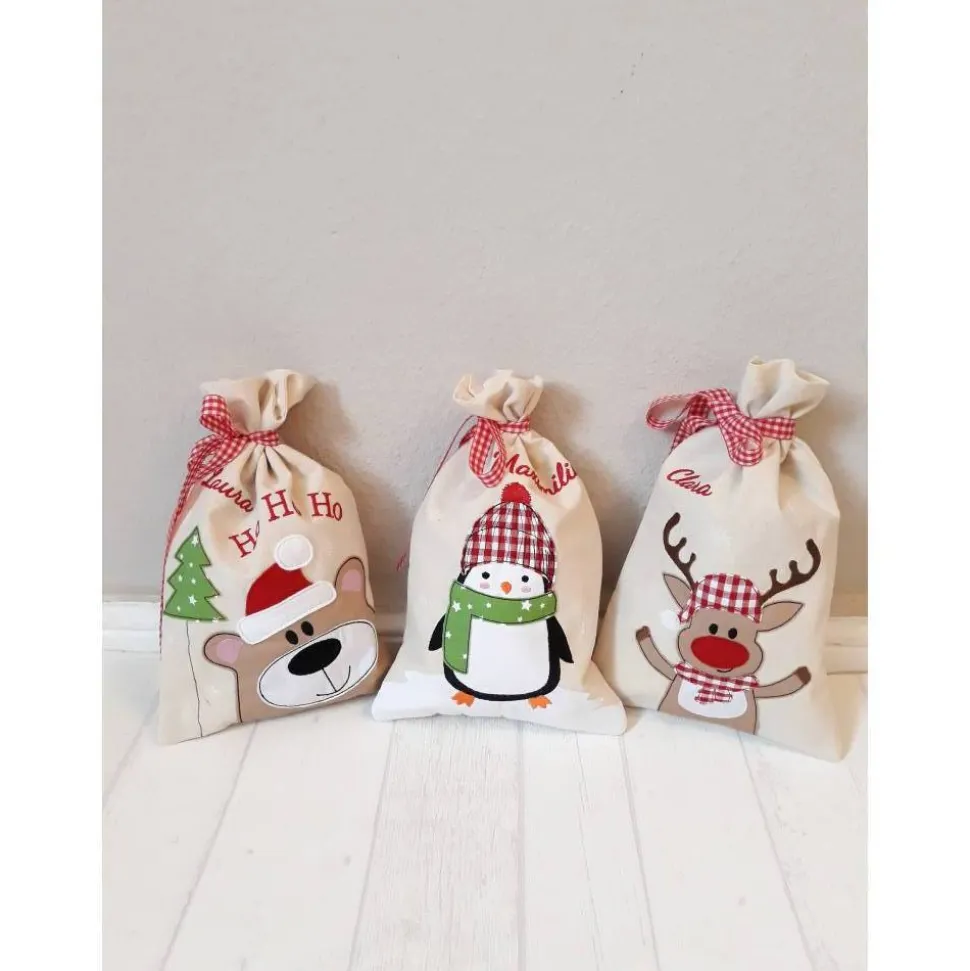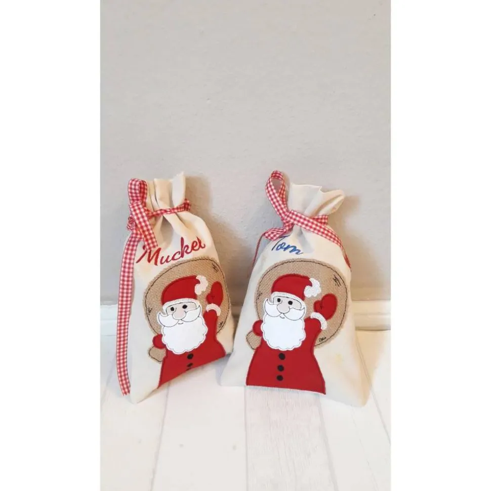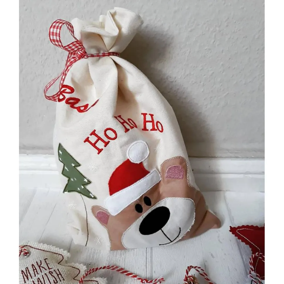 Ich nähe den Beutel aus hellbeiger, naturreiner Baumwolle (Nesselstoff) und besticke ihn mit einem Weihnachtsbärchen, einem Weihnachtsmann, einem Rentier oder einem anderen Weihnachtsmotiv aus Baumwolle und Filz und Deinem Wunschnamen.