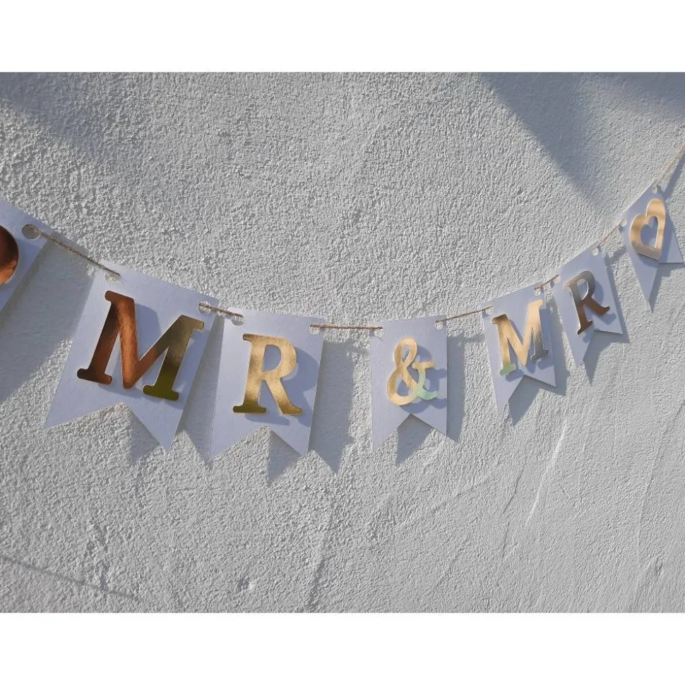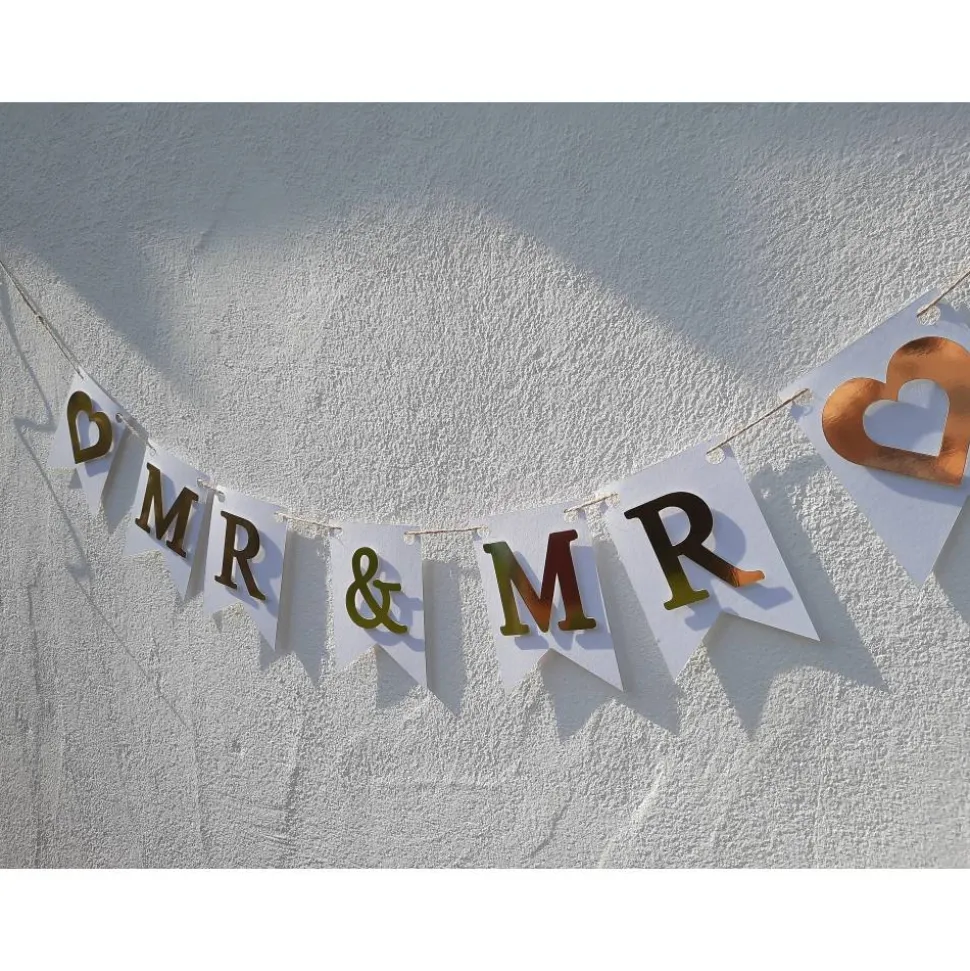 Der Schriftzug Mr & Mr ist in gold gehalten und tritt etwas plastisch hervor. Hierdurch bekommt die Girlande einen ganz besonderen Effekt.
