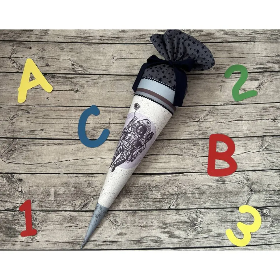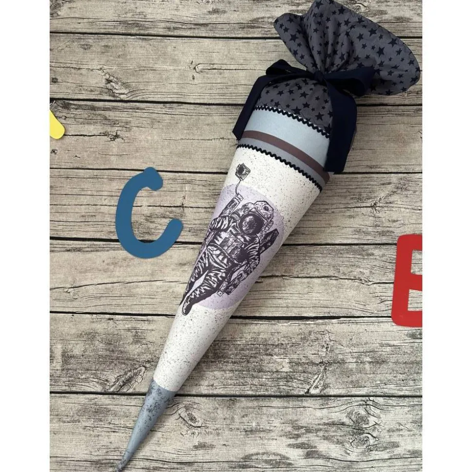 Hier habe ich eine sehr schöne für euch, genäht aus einem tollen Stoffpanel von Stoffwelten mit einem Astronauten-Motiv in Kombi mit dunkelblauer Sternen Baumwolle für den Verschluss. Der Verschluss ist innen mit Tüll verstärkt für einen besseren Stand. Verziert mit schönen Zierbändern.