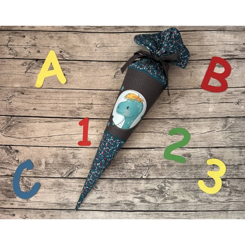 Hier habe ich eine richtig coole Schultüte aus Stoff für euch. Genäht aus hochwertigen tollen Baumwoll-Stoffe in Dunkelblau & grün mit Farbverlauf und bedruckt mit einem richtig tolle Dinosaurier Motiv von Hildmade.