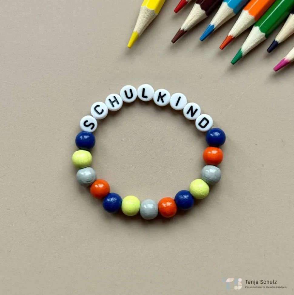 Gefertigt aus 8 mm Holzperlen in bunten Farben und kombiniert mit 6 mm Buchstabenperlen – perfekt für den Schulstart.