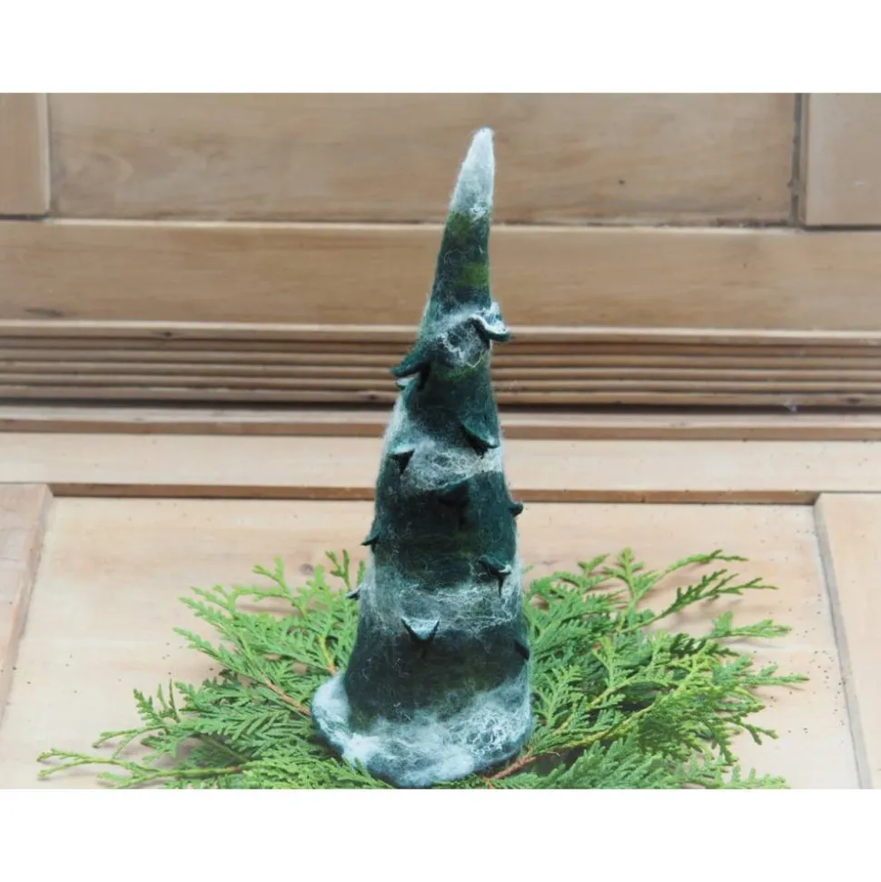 Der Baum ist angefertigt in Nassfilztechnik aus feinster dunkelgrüner und weißer Wolle. Weiße Seide dient der Oberflächengestaltung.
