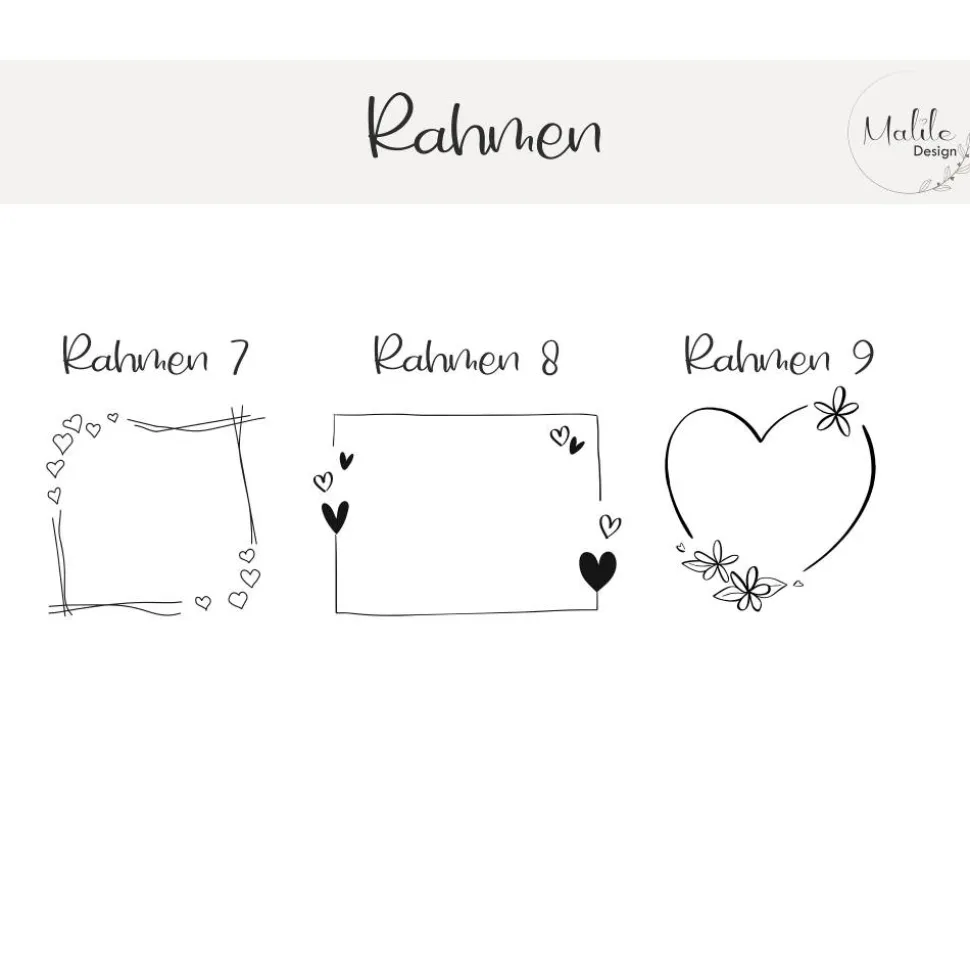 Unter Varianten kannst Du einen Rahmen und die Schriftart wählen. Sieh dir dazu gerne die Beispiele in der Bildergalerie an. Der Aufdruck ist in der Farbe: Schwarz