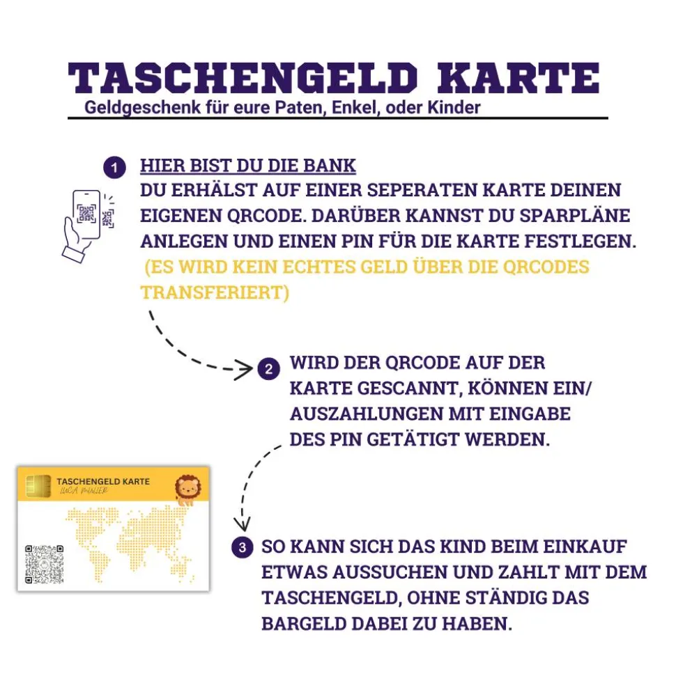 ❤️️ Unsere Taschengeld Karte ist ein ganz tolles Geschenk für eure Paten, Enkel, oder eigenen Kinder. Hier wird kein echtes Geld transferiert. Du bist hier die Bank.