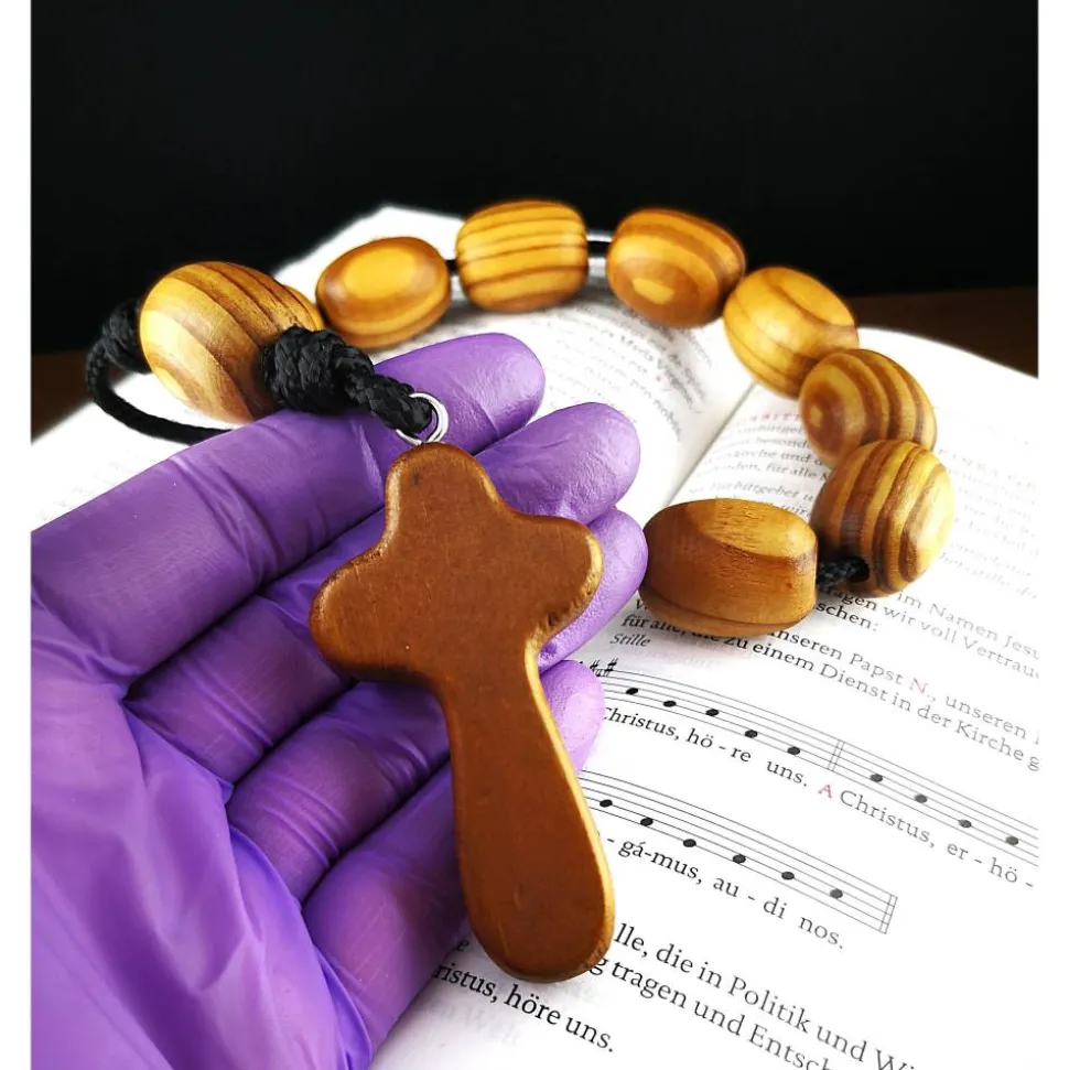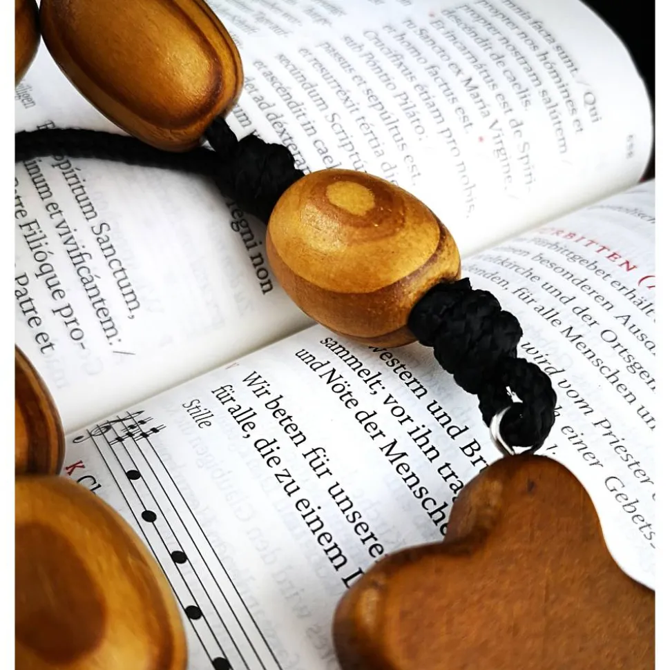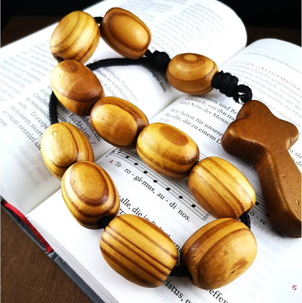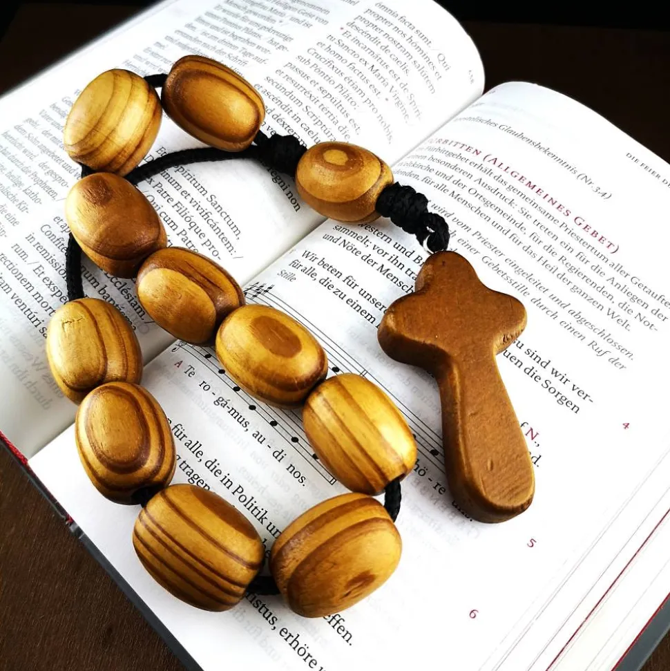 Dieser besondere Rosenkranz besteht aus 10 + 1 großen Holzperlen mit ca. 20×25 mm, die auf einer robusten, dicken Nylonschnur aufgereiht sind.