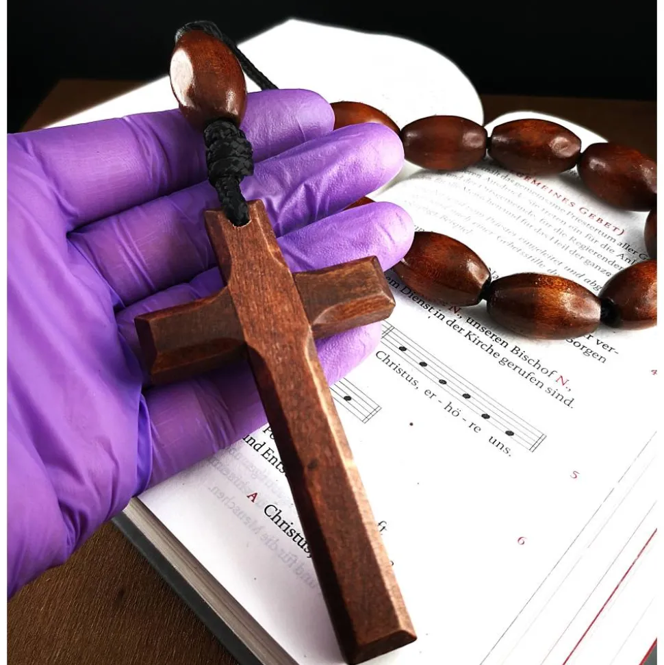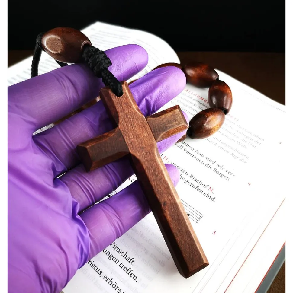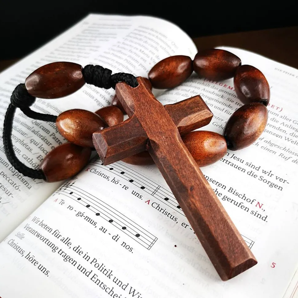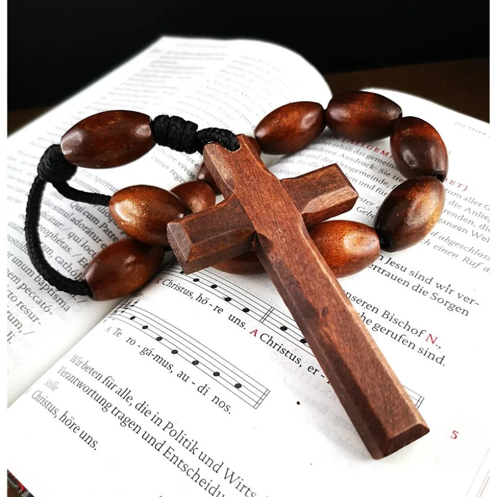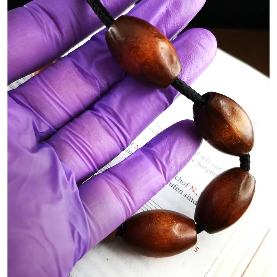 Dieser besondere Rosenkranz besteht aus 10 + 1 großen Holzperlen mit ca. 16×25 mm, die auf einer robusten, dicken Nylonschnur aufgereiht sind.