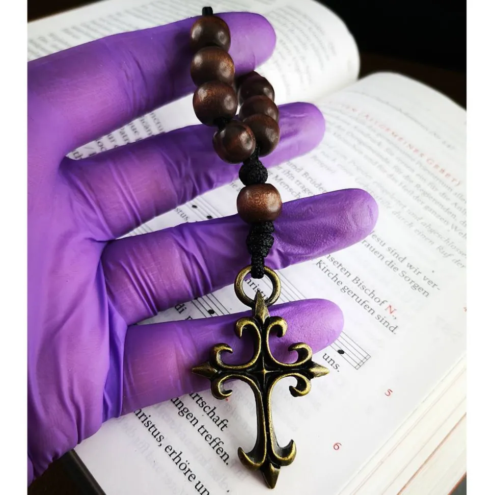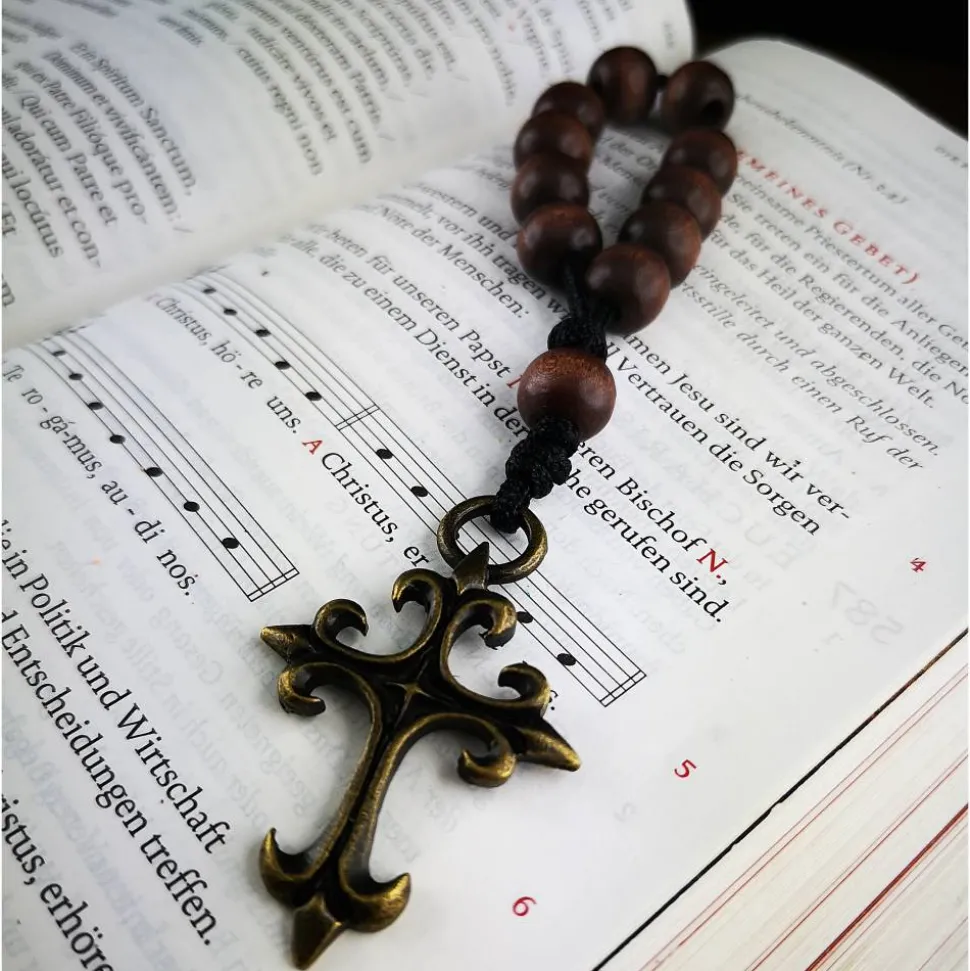 Entdecke den handgeknüpften Taschenrosenkranz, auch bekannt als Fingerrosenkranz, für deinen Alltag. Dieser katholische Rosenkranz besteht aus 10 + 1 dunklen Holzperlen, die jeweils ca. 10 mm groß sind und auf einer reißfesten Nylonschnur aufgereiht wurden.
