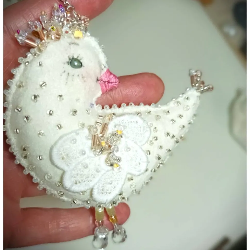 Ein von mir handgemachtes edles Vogelküken elegant und festlich anzuschauen sucht ein neues Heim.Durch das Design in naturweiß creme mit Akzenten von rosegold ist es wunderschön passend zu deinem Landhausstil und shabby chic look. Als hochwertige Dekoration mit Barockperlen in creme und silberverspiegelten Roccailles verziert funkelt es am Fenster, als Hochzeitsdeko oder im Osterstrauss. Komplett von Hand gemacht und in der Ausstrahlung auffälliges sehr aufwändig von mir handbesticktes Vogelornament mit einer Vielzahl Roccailles verschiedener Art aus Glas gemixt mit Akzenten aus schmmernden Barockperlen und Biwaperlen in Nuancen von altweiß werden in dieser Luxus Wohndeko harmonisch in Szene gesetzt.. Das Küken kann am Kettchen auffgehängt werden und die kleine Quaste wie funkelnde Beinchen und die umstickt Kontur bringt zusätzliche Lichtreflexe in den ganzen Raum.
