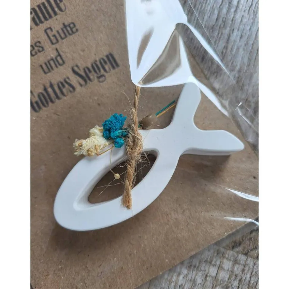 Der Fisch wurde mit Trockenblumen und einer kleinen Motivperle dekoriert.
