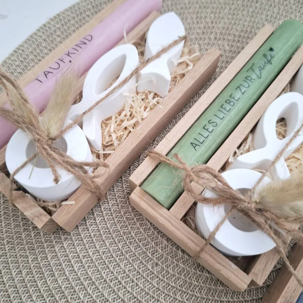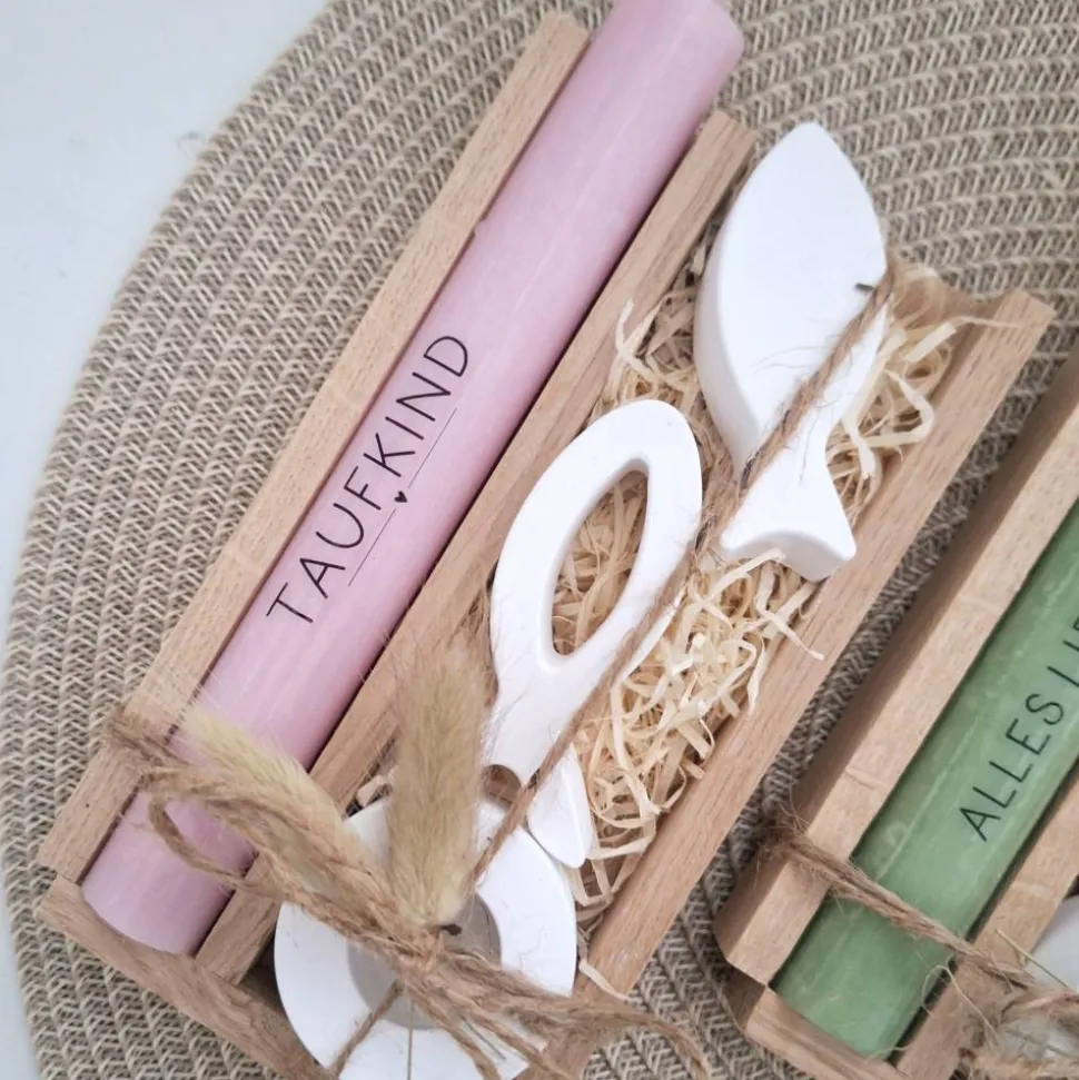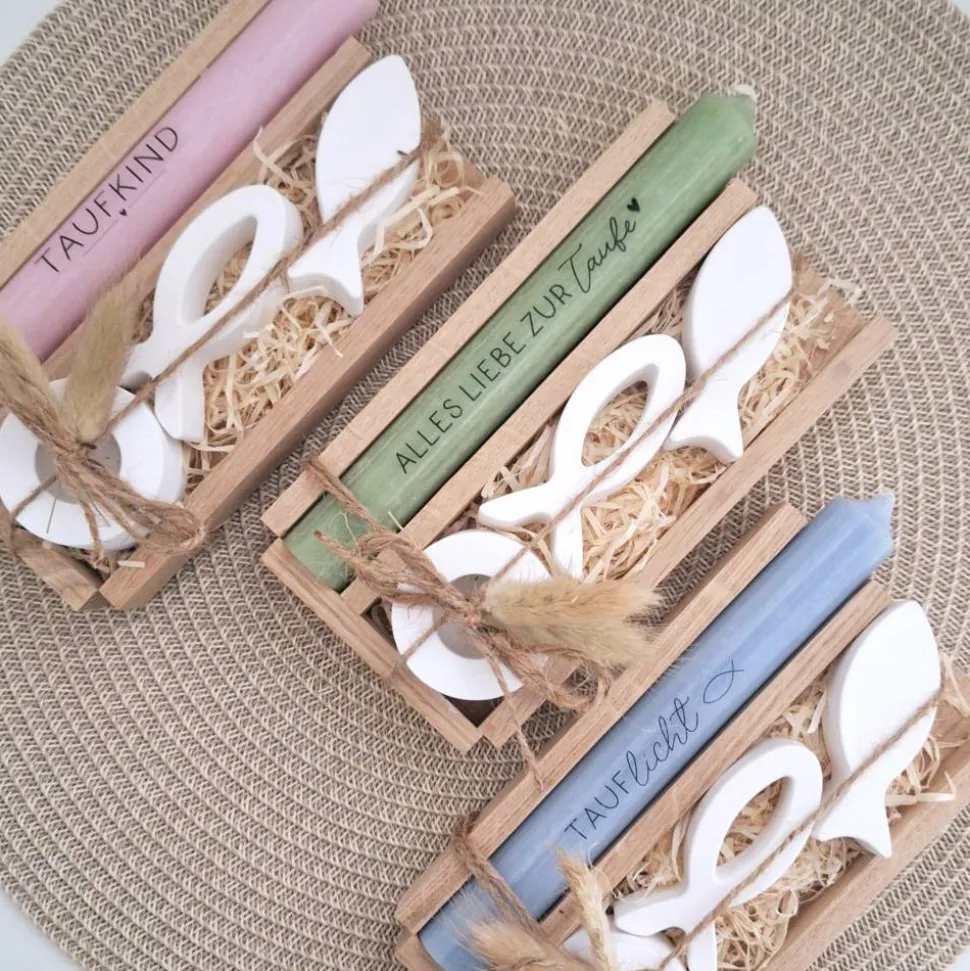 Das Set besteht aus einer Kerze (in der Farbe deiner Wahl) mit einem Taufspruch nach Wahl, einem runden Kerzenhalter und zwei symbolischen Fischen in einer Holzbox.