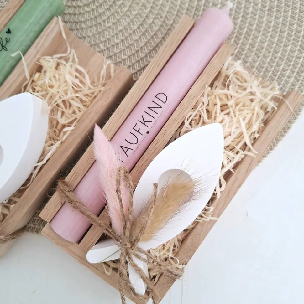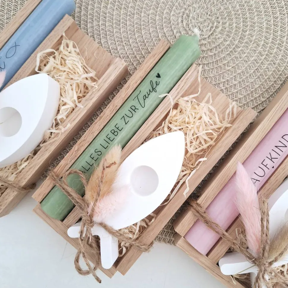 Das Set besteht aus einer Kerze (in der Farbe deiner Wahl) mit einem Taufspruch nach Wahl und einem Kerzenhalter in Fischform