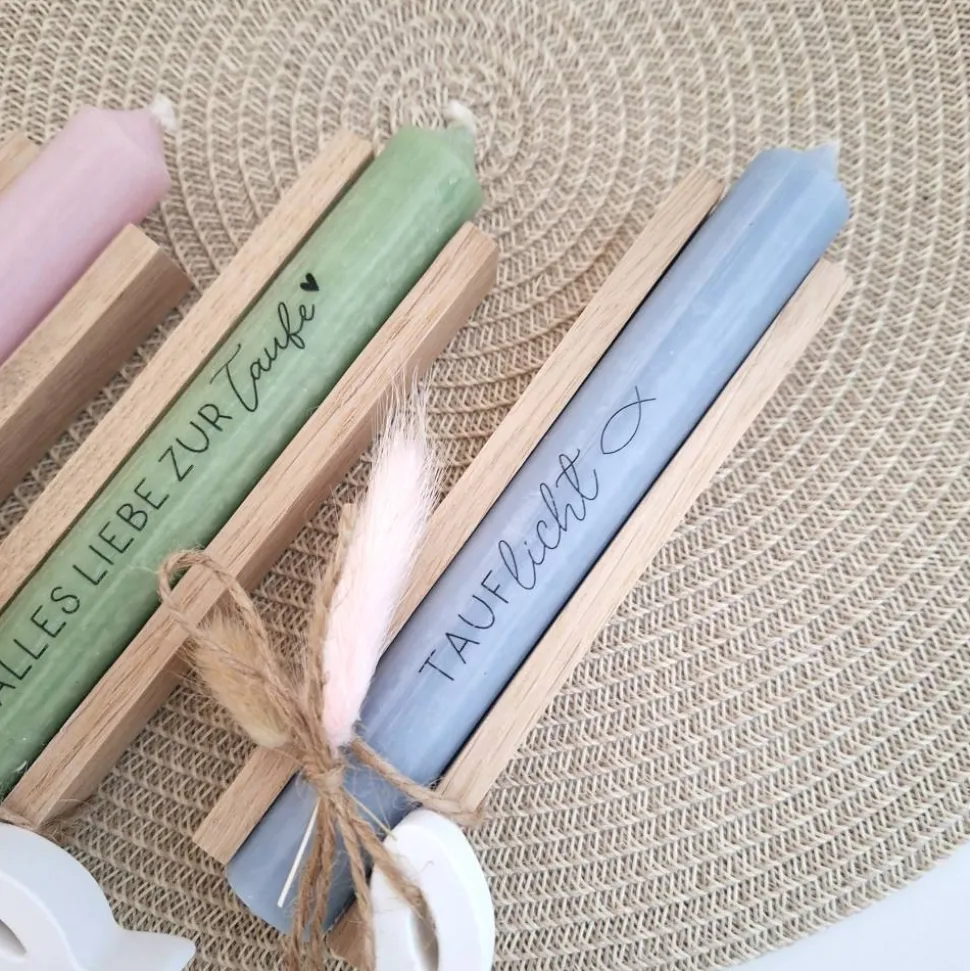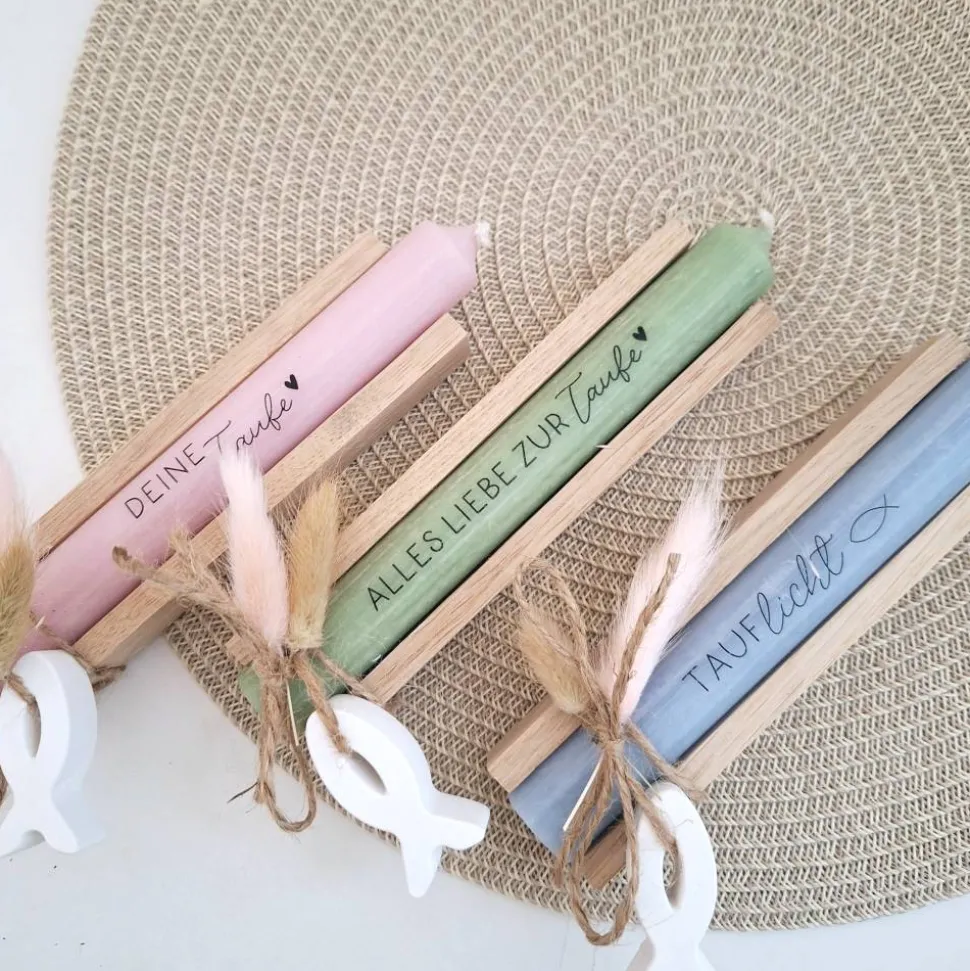 Das Set besteht aus einer Kerze (in der Farbe deiner Wahl) mit einem Taufspruch nach Wahl und einem symbolischen Fisch.
