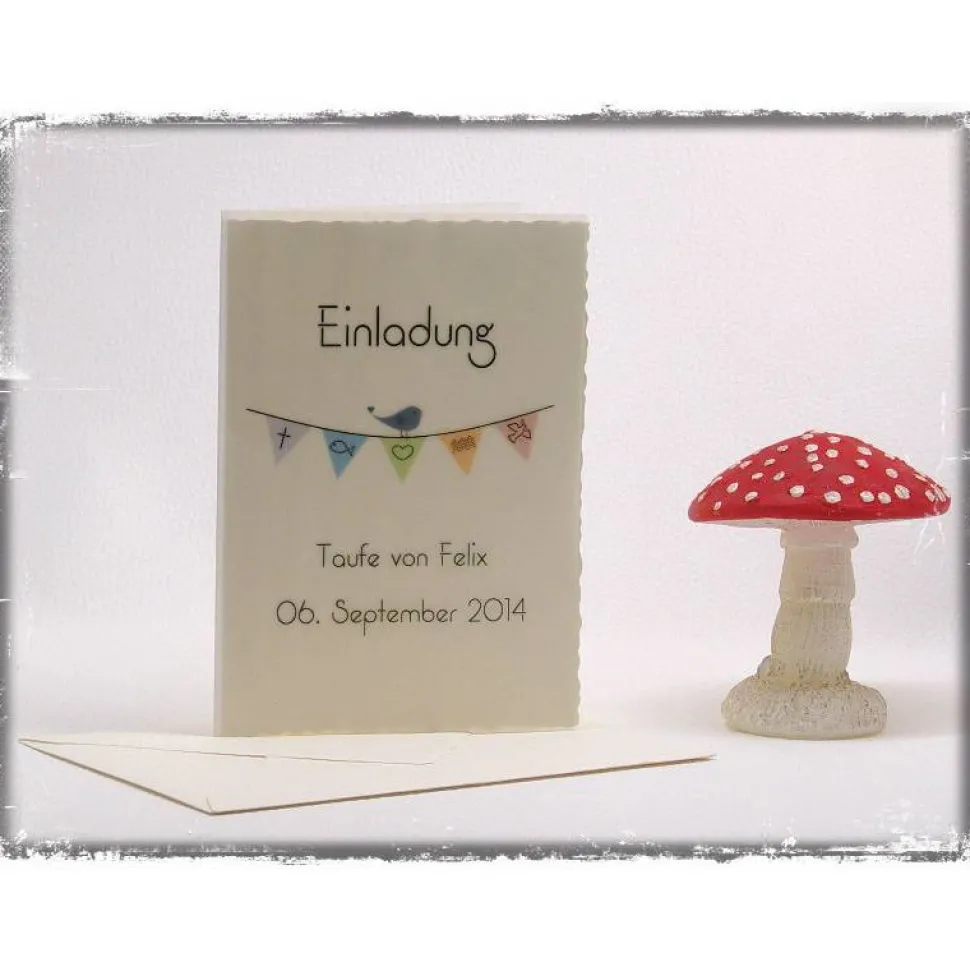 Über diese hübsche Einladungskarte freut sich jeder Gast. Ein süßes blaues Vögelchen hüpft auf einer fröhlich bunten Wimpelkette, die mit christlichen Symbolen bedruckt ist. Darunter findet sich sich der Name des Täuflings sowie das Taufdatum. Natürlich fertigen wir Euch auch gerne eine Version für Zwillinge oder mehrere Kinder mit mehreren Vögelchen auf der Wimpelkette an.
