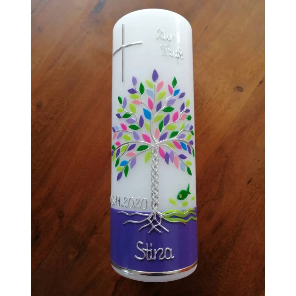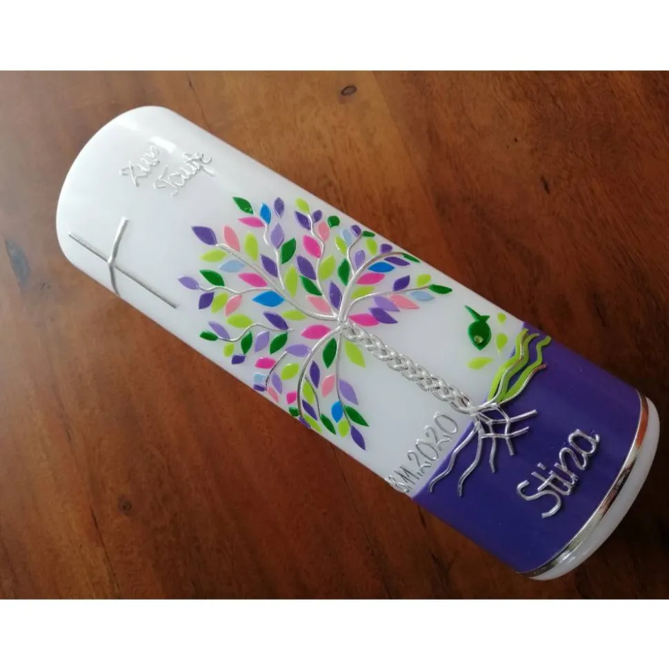 Taufkerze Lebensbaum mit hochwertigen Wachsverzierungen und Beschriftung aus Buchstabenperlen