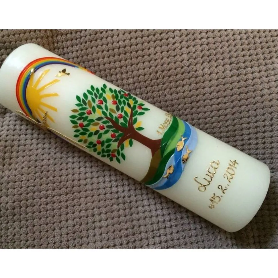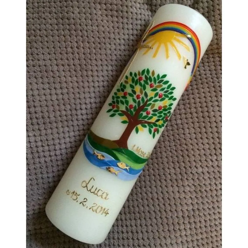 Die Taufkerze Lebensbaum hat die Größe 30 x 8 cm