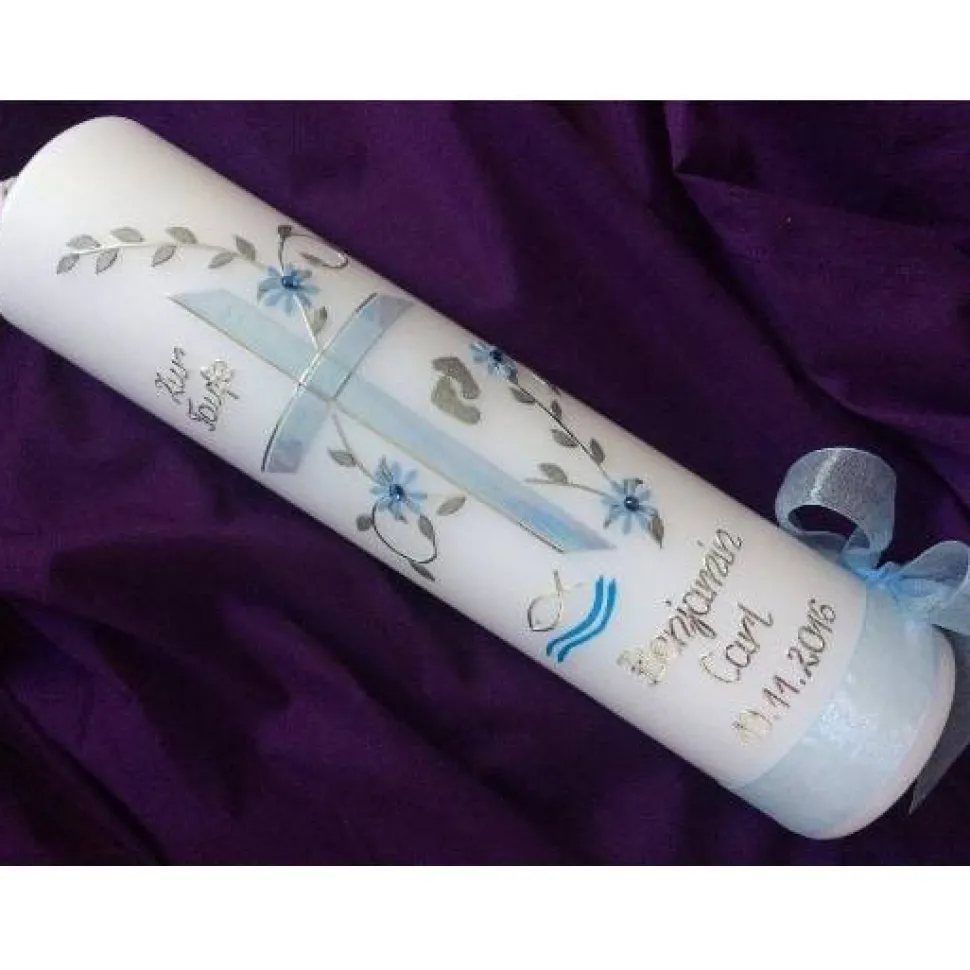 Die Verzierung auf der Kerze wird in liebevoller Handarbeit für Sie erstellt.