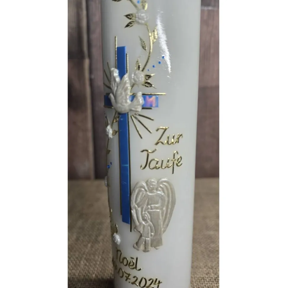 Bitte bei der Bestellung unbedingt angeben ob die Kerze mit oder ohne den Schriftzug: „Zur Taufe“ gefertigt werden soll.