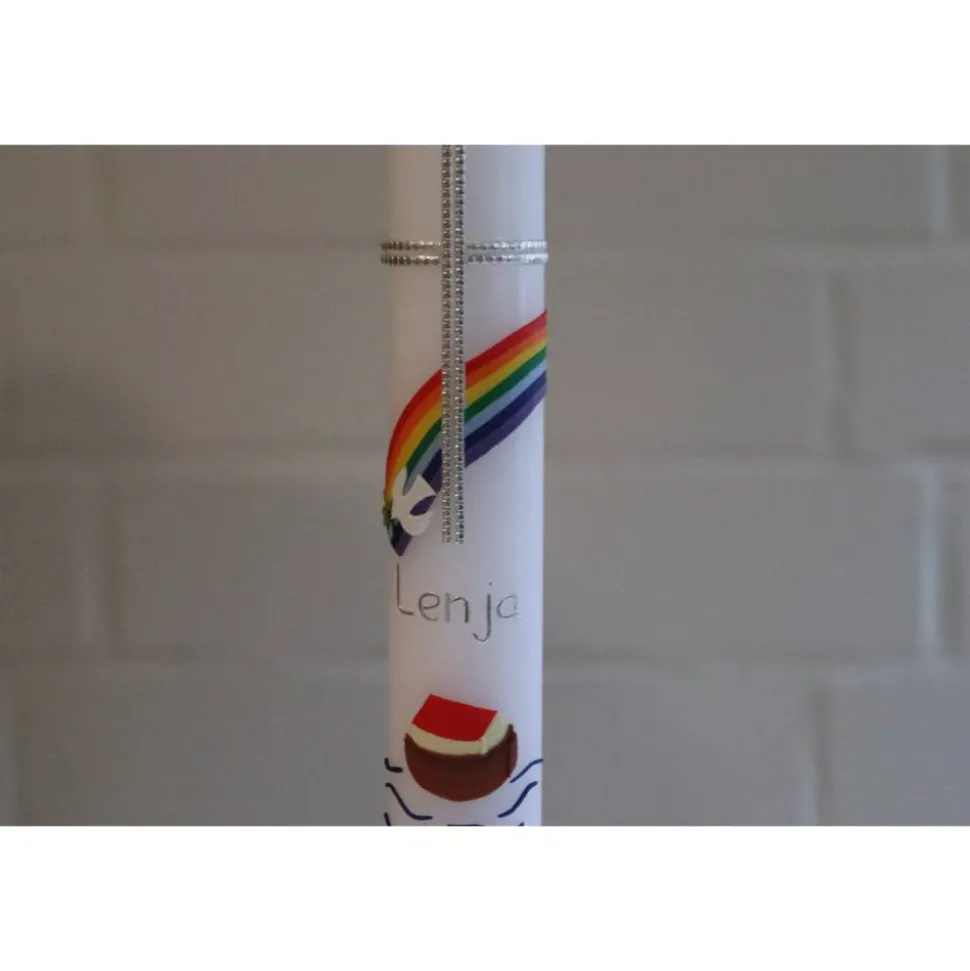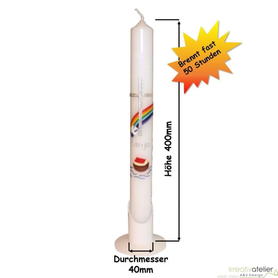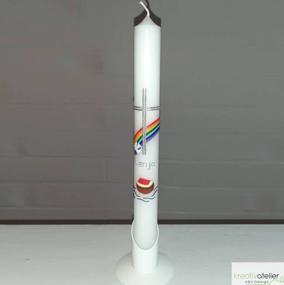 Die Arche Noah auf der Kerze steht für Rettung und Schutz und verleiht ihr eine hoffnungsvolle Ausstrahlung. Das Wasser mit dem Regenbogen, das die Arche umgibt, symbolisiert das heilige Ritual der Taufe und die Reinigung des Geistes und der Seele. Die Taube mit dem Zweig neben der Arche betont die Bedeutung von Frieden und Hoffnung und verleiht der Kerze eine spirituelle Bedeutung.