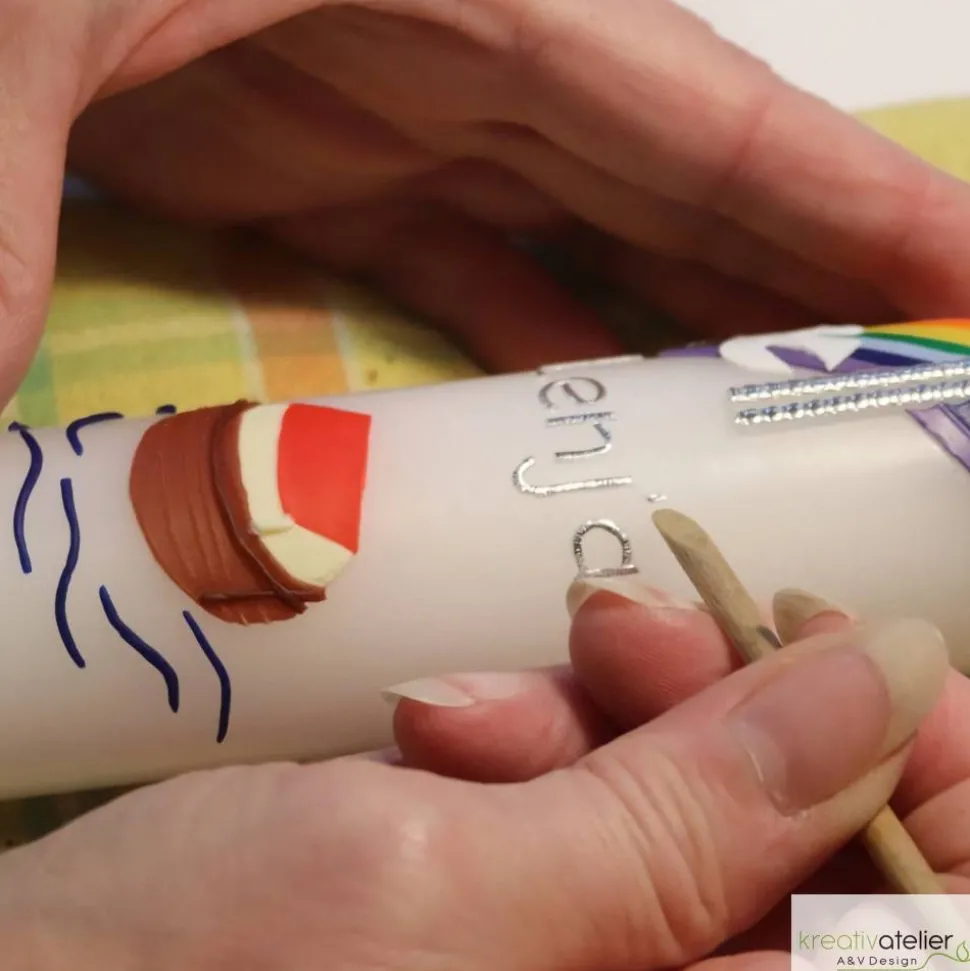 Die Taufkerze kann mit Namen und Datum personalisiert werden. Für die Beschriftung verwende ich Buchstaben aus echtem Wachs (kein Vinyl). Im Preis enthalten sind maximal 1 Vorname und ein Datum bestehend 6 Ziffern (z.B. 22.10.23) oder 2 Vornamen ohne Datum.