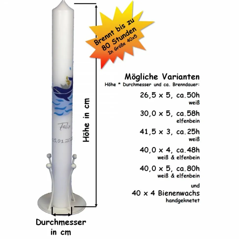Im Preis enthalten ist die Kerze inklusive Beschriftung, Aufbewahrungskarton und Brennanleitung. Der Versand innerhalb von Deutschland ist im Preis enthalten. Nicht im Preis enthalten sind evtl. auf den Fotos abgebildetes Zubehör (wie z.B. Tropfenfänger oder Kerzenständer) und Dekorationsartikel.