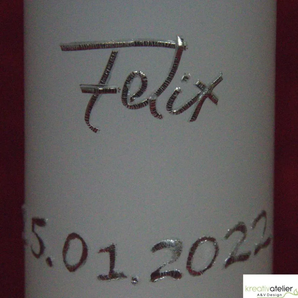 Auch die Beschriftung erfolgt mit echten Wachsbuchstaben in silber oder gold wie abgebildet. Kein Vinyl. Im Preis enthalten sind maximal 1 Vorname und ein Datum bestehend 6 Ziffern (z.B. 22.10.23) oder 2 Vornamen ohne Datum. Teilen Sie mir in dem dafür vorgesehenen Feld bitte Ihren Beschriftungswunsch mit (also Name und Datum).
