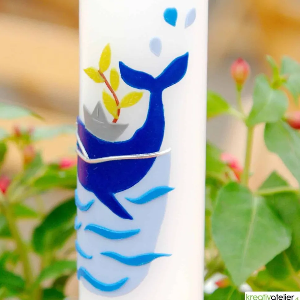 Diese weiße Taufkerze ist ein besonderes Kunstwerk, das eine einzigartige Geschichte erzählt. Der blaue Walfisch symbolisiert Kraft, Hofffnung, Stärke, Größe und Abenteuerlust. Außerdem ist das Motiv an die beliebte Bibelgeschichte „Jona und der Wal“ angelehnt. Das Meer und das Schiffchen, stehen für die unendlichen Möglichkeiten und das Abenteuer, das das Kind im Leben erwartet. Es trägt ihn durch die Stürme des Lebens und gibt ihm Halt und Sicherheit.